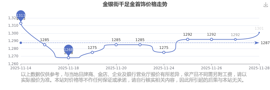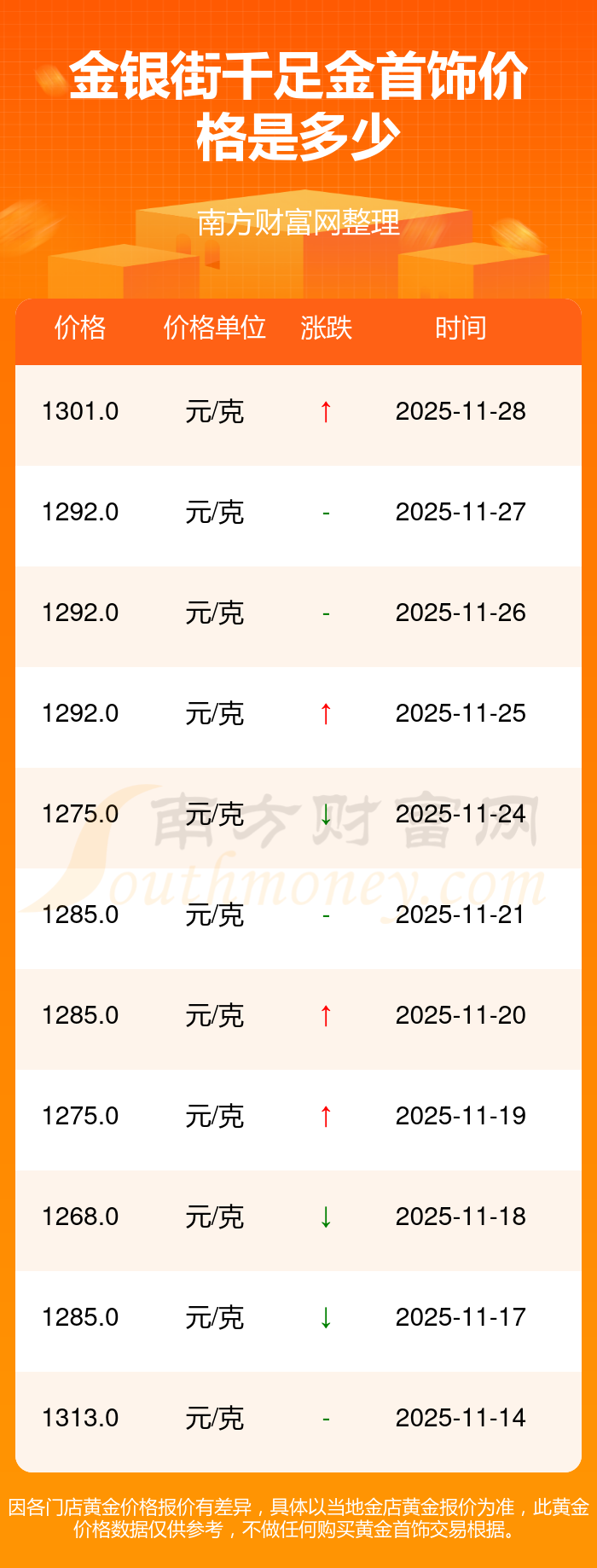 今日(2025年11月29日)金銀街千足金首飾價格是1301.0元/克。