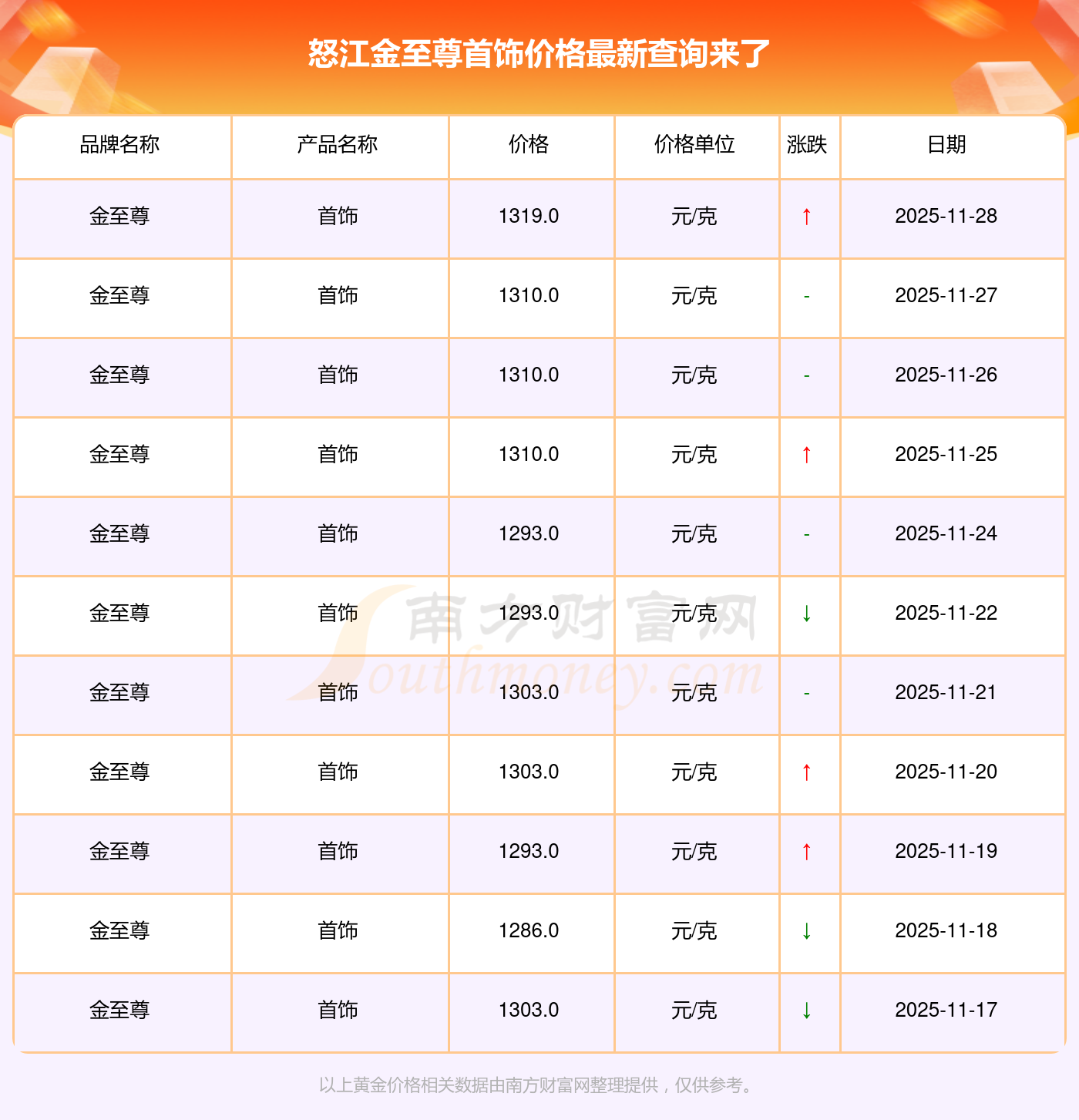 今日(2025年11月29日),1319.0元/克是怒江金至尊首飾的價(jià)格標(biāo)準(zhǔn)。