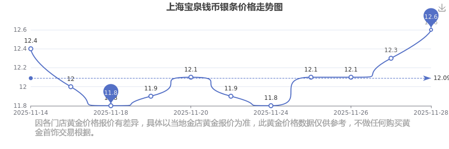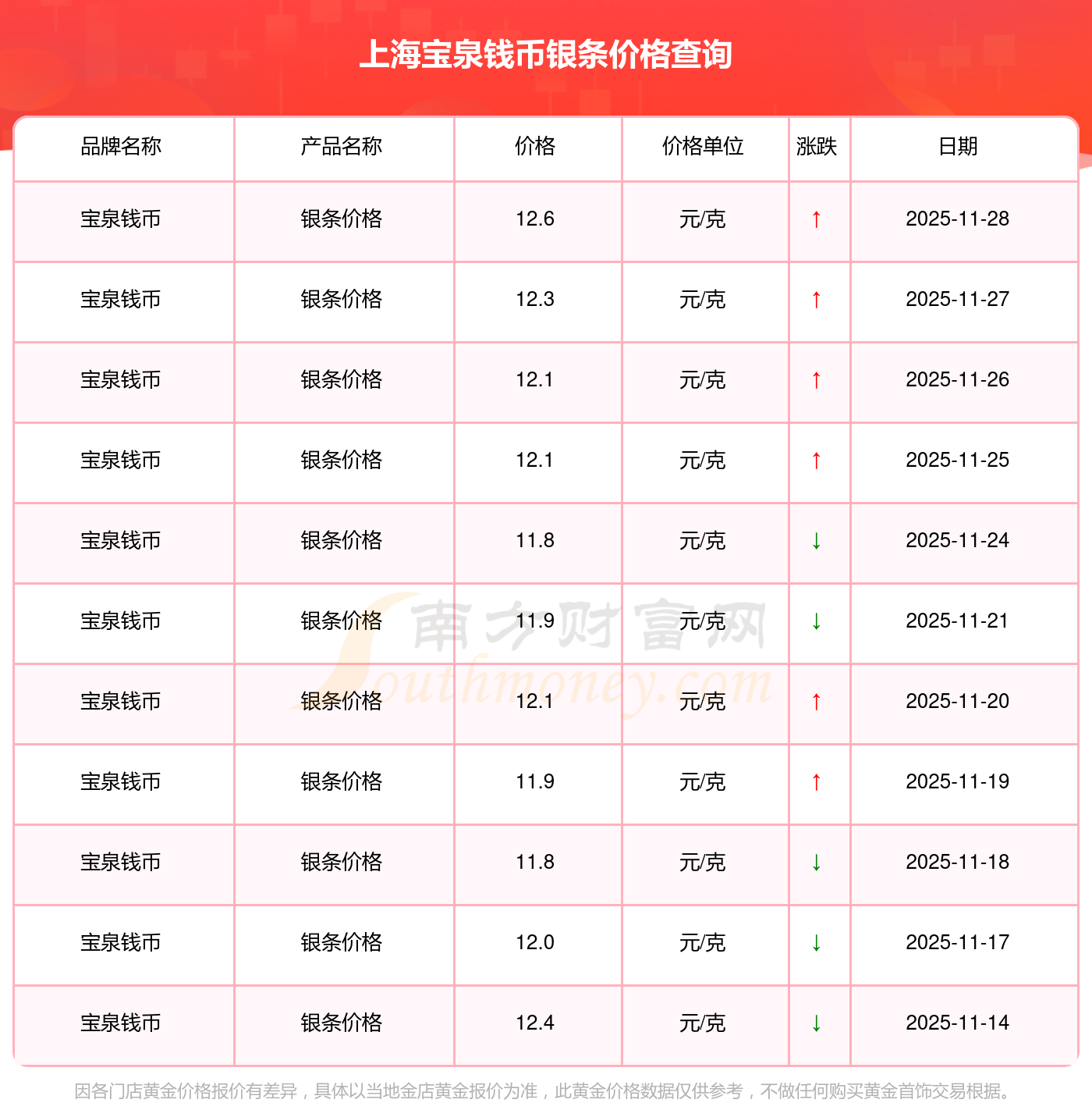 上海寶泉錢幣在 2025年11月29日,銀條價格的售賣價格是 12.6元/克。