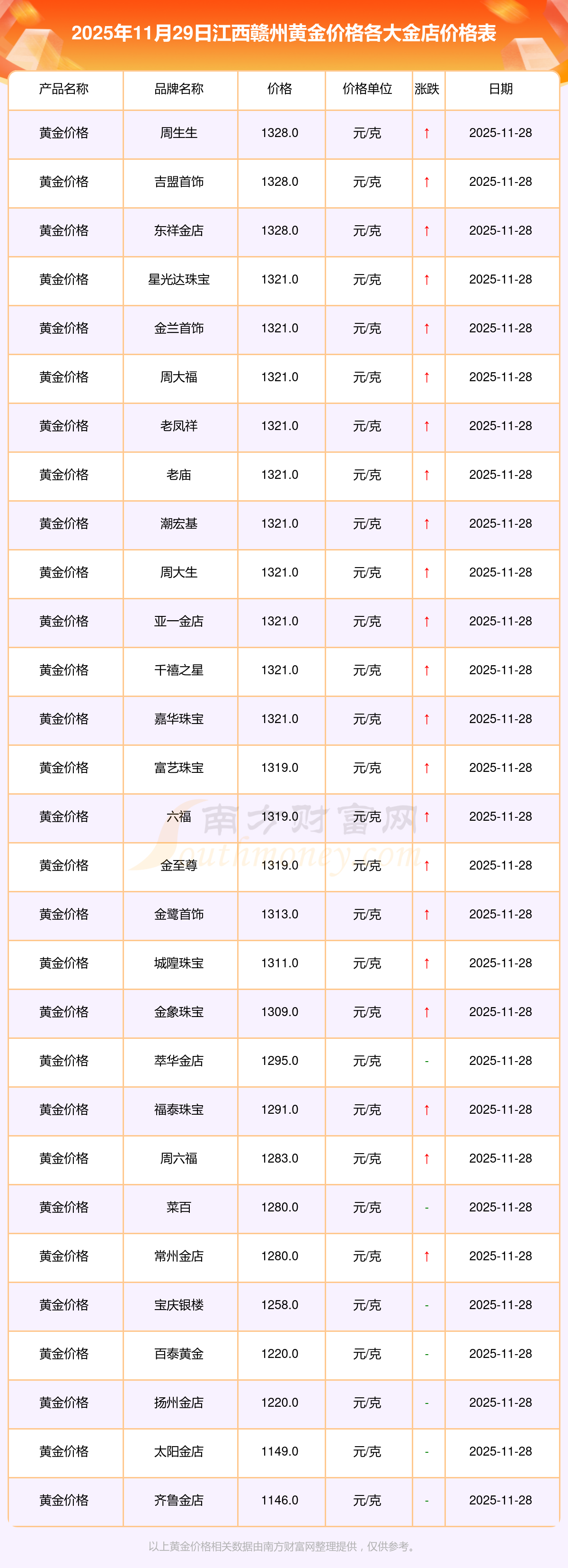 2025年11月29日江西贛州各大金店黃金價(jià)格最新價(jià)格:星光達(dá)珠寶1321.0元/克,星光達(dá)珠寶600.0元/克,寶泉錢幣12.6元/克,金蘭首飾1321.0元/克,金蘭首飾600.0元/克,謝瑞麟1207.0元/克,謝瑞麟1321.0元/克,謝瑞麟46370.0,謝瑞麟13970.0,謝瑞麟41860.0,金銀街1296.0元/克。