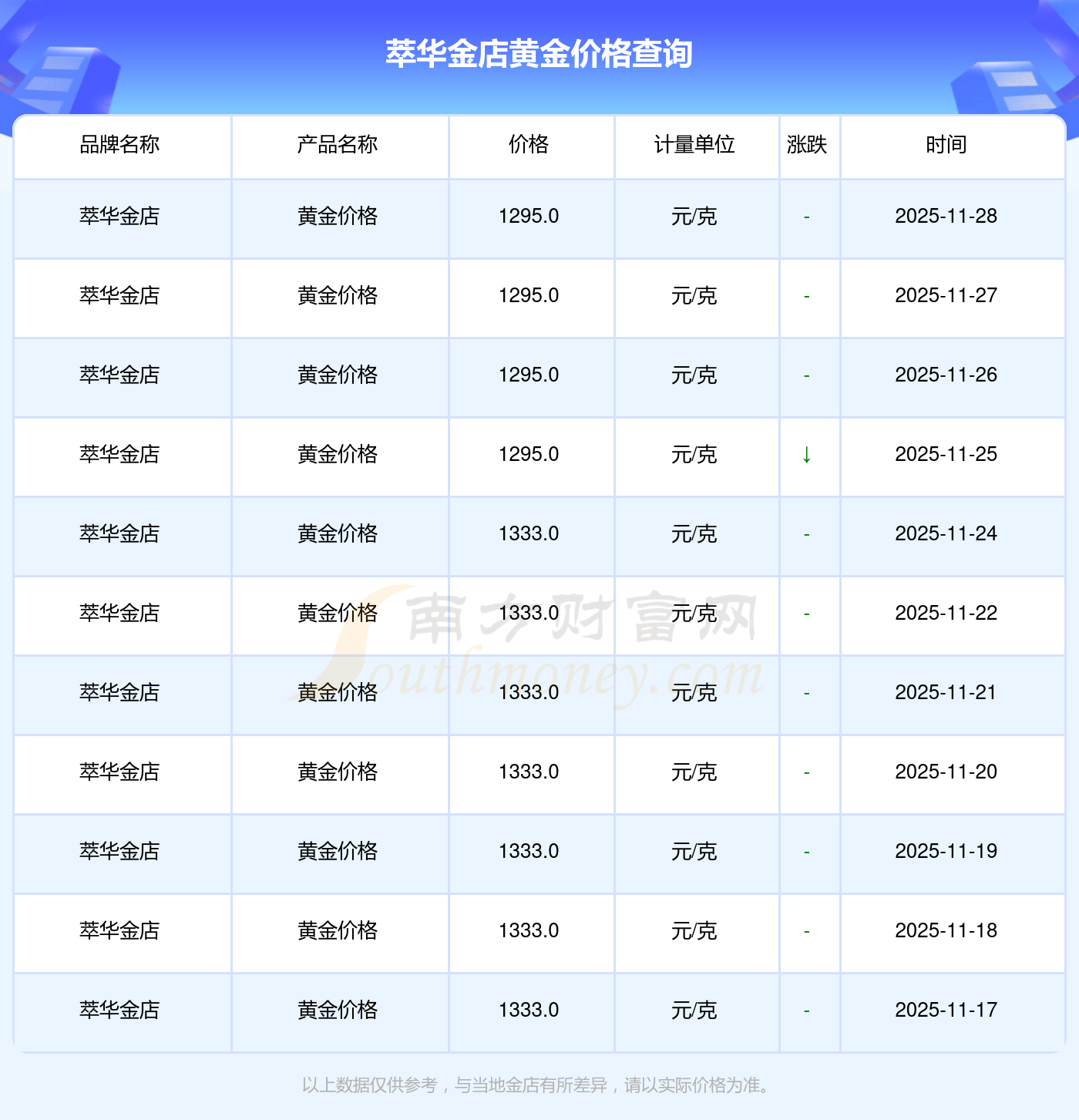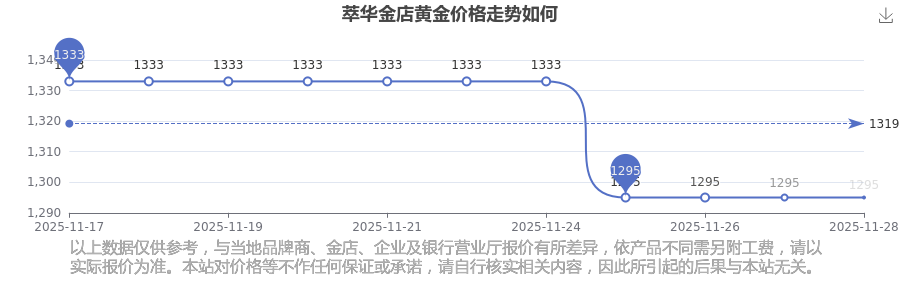 萃華金店 黃金價(jià)格在今日的最新價(jià)格顯示為1295.0元/克。