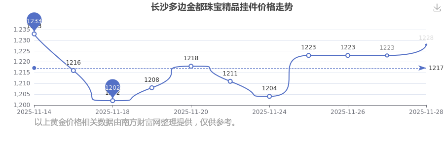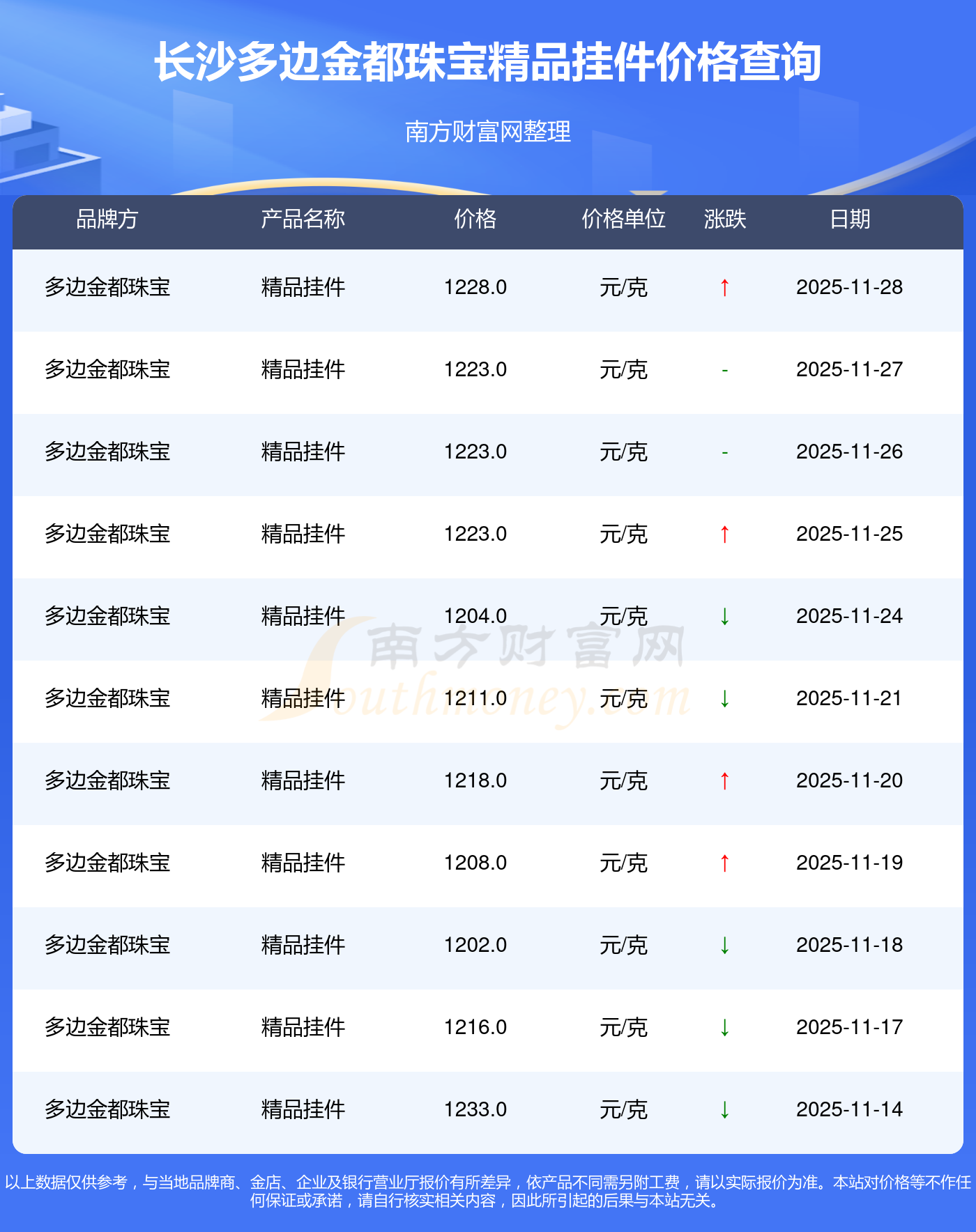 長沙多邊金都珠寶今日精品掛件價(jià)格最新公布(當(dāng)下購買一克黃金的價(jià)格是多少)?今日長沙多邊金都珠寶精品掛件價(jià)格查詢,(2025年11月29日)今日長沙多邊金都珠寶精品掛件價(jià)格是1228.0元/克。