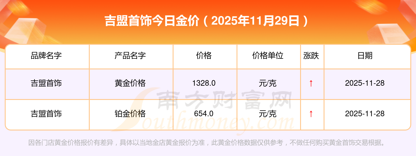 2025年11月29日星光達珠寶、星光達珠寶、寶泉錢幣、金蘭首飾、金蘭首飾、謝瑞麟、謝瑞麟、謝瑞麟、謝瑞麟、謝瑞麟、金銀街等各大金店品牌黃金價格最新價格如下:星光達珠寶黃金價格1321.0元/克,星光達珠寶鉑金價格600.0元/克,寶泉錢幣銀條價格12.6元/克,金蘭首飾黃金價格1321.0元/克,金蘭首飾鉑金價格600.0元/克,謝瑞麟金條價格(內地)1207.0元/克,謝瑞麟金飾價格(內地)1321.0元/克,謝瑞麟黃金飾品(香港)46370.0,謝瑞麟鉑金飾品(香港)13970.0,謝瑞麟金條金價(香港)41860.0,金銀街投資金條1296.0元/克。