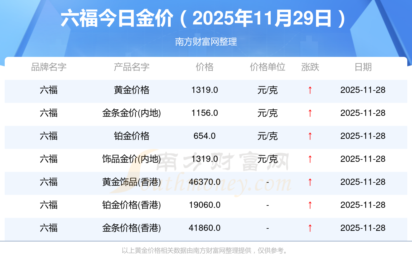 2025年11月29日六福最新價格:黃金價格1321.0元/克,鉑金價格600.0元/克,銀條價格12.6元/克,黃金價格1321.0元/克,鉑金價格600.0元/克,金條價格(內地)1207.0元/克,金飾價格(內地)1321.0元/克,黃金飾品(香港)46370.0,鉑金飾品(香港)13970.0,金條金價(香港)41860.0,投資金條1296.0元/克。