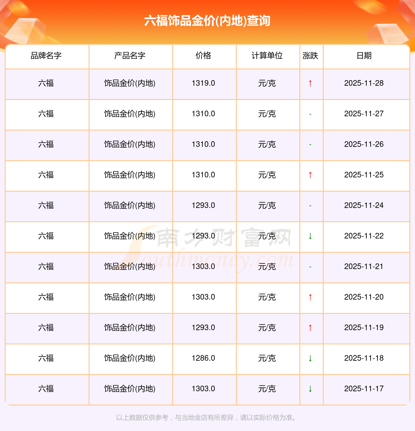 今日六福飾品金價(內(nèi)地)的價格是1319.0元/克。