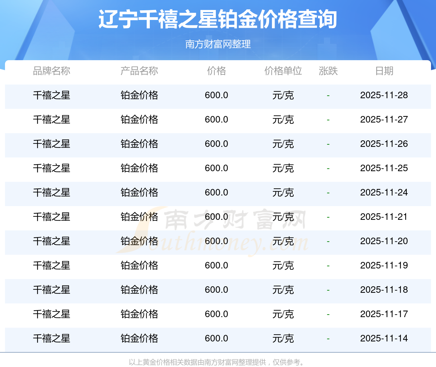 今日遼寧千禧之星鉑金價格最新為:600.0元/克。