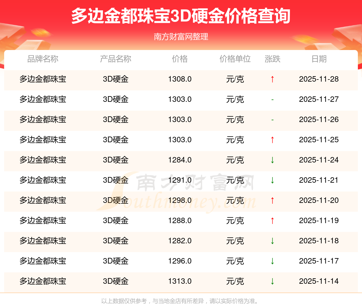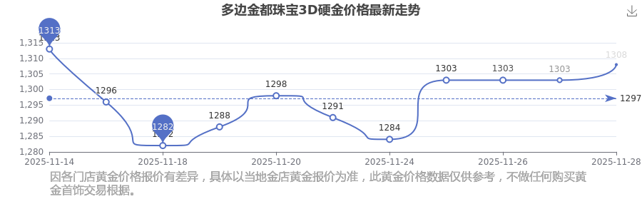 今日(2025年11月29日)多邊金都珠寶3D硬金價格為1308.0元/克。
