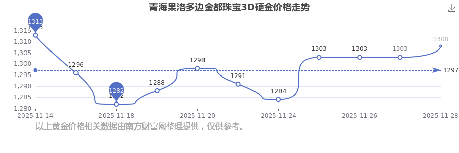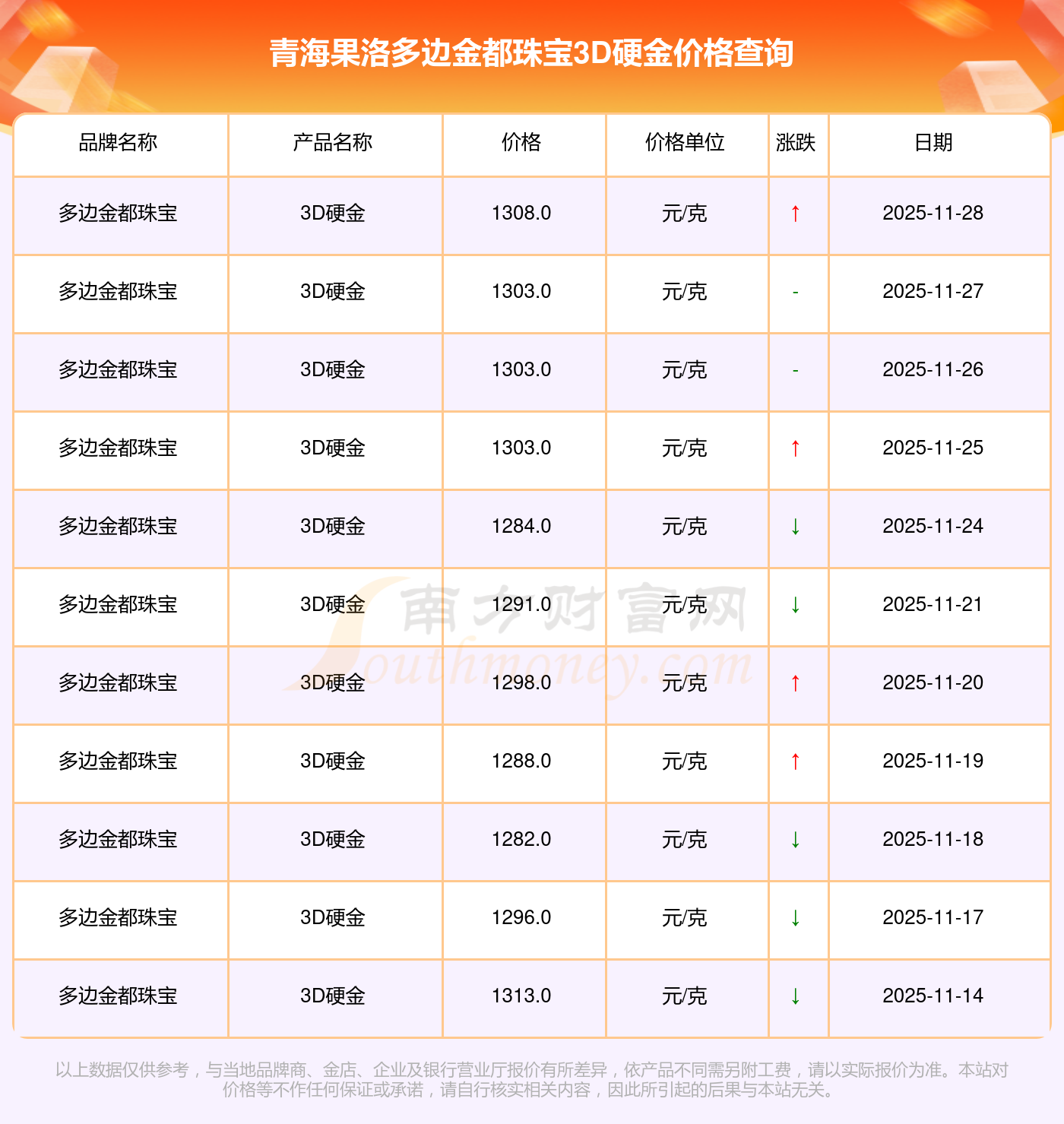 青海果洛多邊金都珠寶在 2025年11月29日,3D硬金的售賣價格是 1308.0元/克。