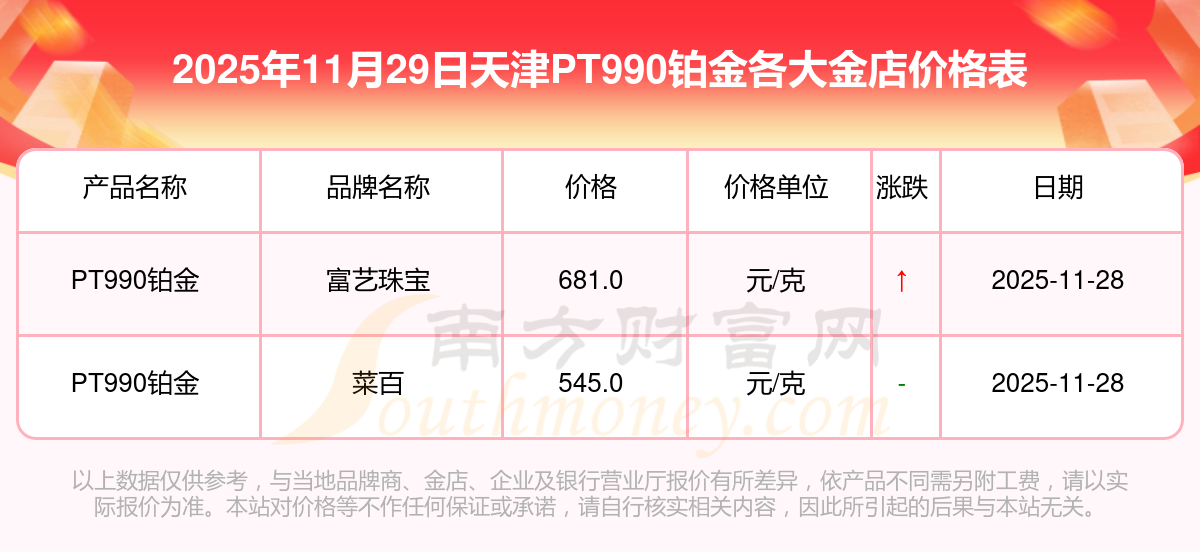 2025年11月29日天津各大金店PT990鉑金最新價格:星光達珠寶1321.0元/克,星光達珠寶600.0元/克,寶泉錢幣12.6元/克,金蘭首飾1321.0元/克,金蘭首飾600.0元/克,謝瑞麟1207.0元/克,謝瑞麟1321.0元/克,謝瑞麟46370.0,謝瑞麟13970.0,謝瑞麟41860.0,金銀街1296.0元/克。