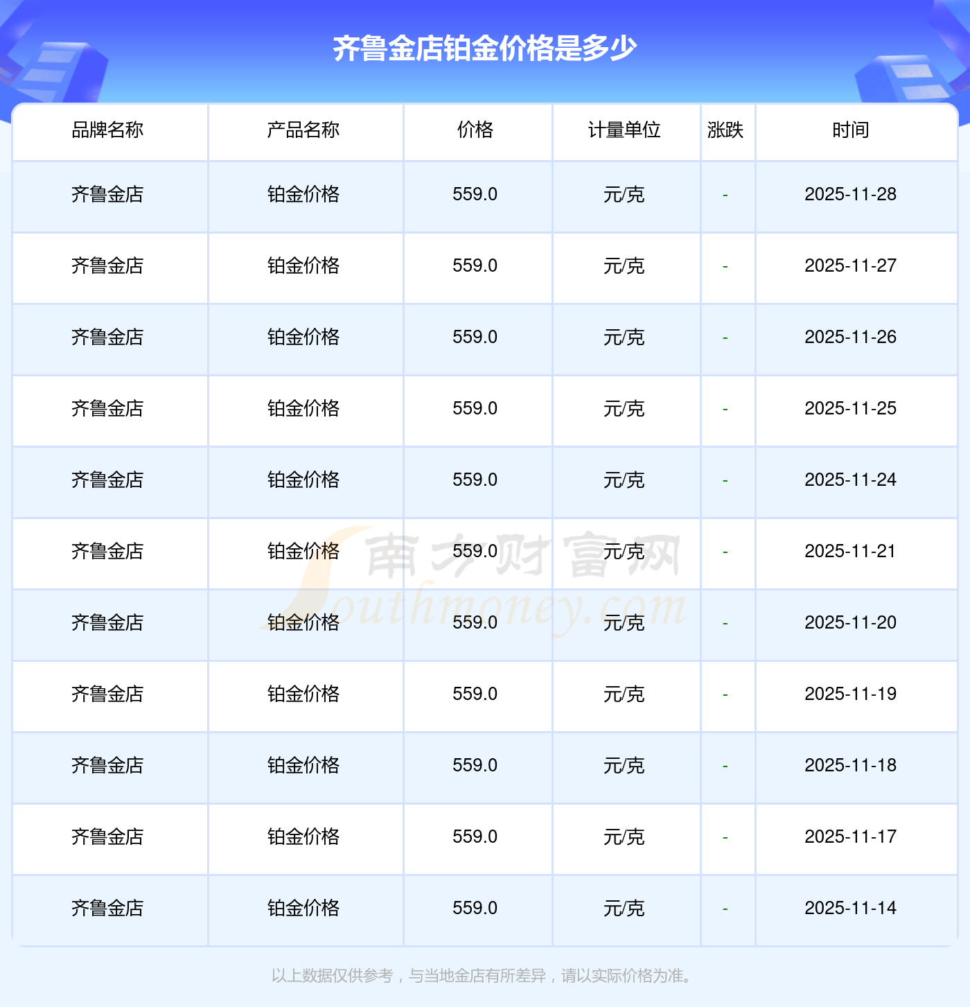 2025年11月29日齊魯金店鉑金價(jià)格最新是559.0元/克。