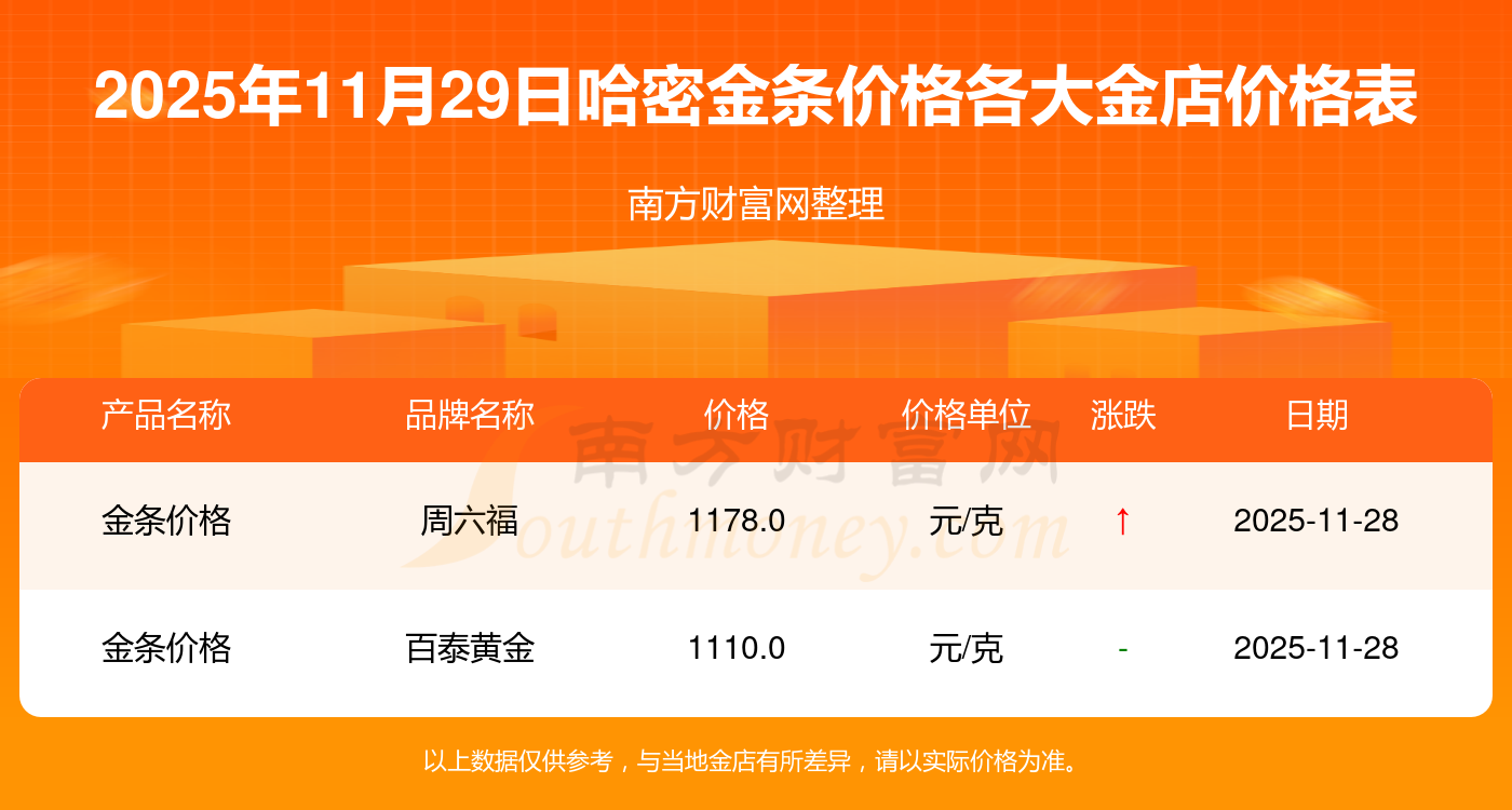 今天是2025年11月29日,哈密星光達(dá)珠寶、星光達(dá)珠寶、寶泉錢幣、金蘭首飾、金蘭首飾、謝瑞麟、謝瑞麟、謝瑞麟、謝瑞麟、謝瑞麟、金銀街等各大金店品牌金條價格最新價格行情是這樣的:星光達(dá)珠寶1321.0元/克、星光達(dá)珠寶600.0元/克、寶泉錢幣12.6元/克、金蘭首飾1321.0元/克、金蘭首飾600.0元/克、謝瑞麟1207.0元/克、謝瑞麟1321.0元/克、謝瑞麟46370.0、謝瑞麟13970.0、謝瑞麟41860.0、金銀街1296.0元/克。