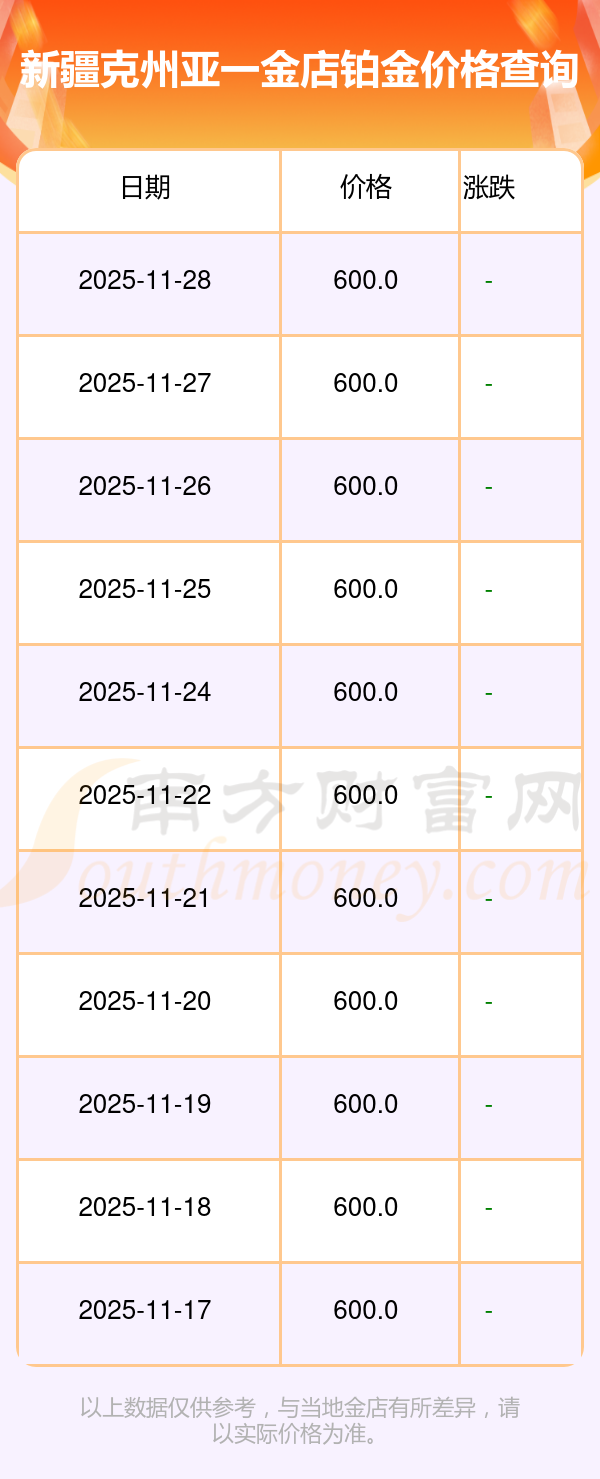 今日(2025年11月29日)新疆克州亞一金店鉑金價(jià)格是600.0元/克。