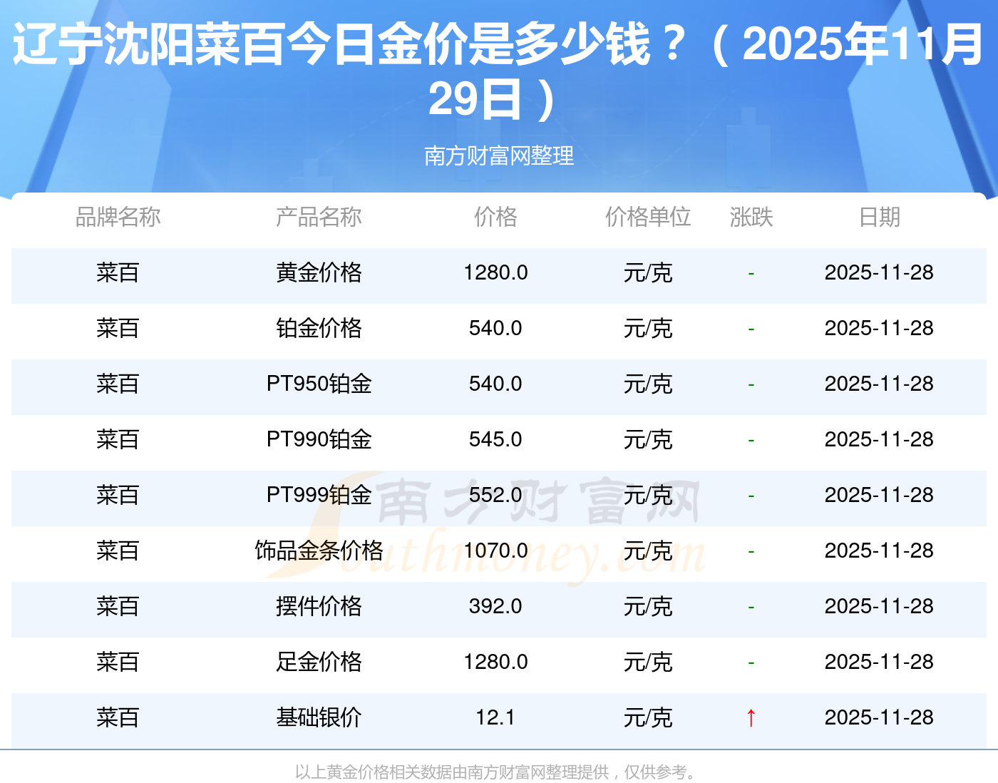 2025年11月29日遼寧沈陽菜百現(xiàn)在黃金一克要多少錢:黃金價格1321.0元/克,鉑金價格600.0元/克,銀條價格12.6元/克,黃金價格1321.0元/克,鉑金價格600.0元/克,金條價格(內(nèi)地)1207.0元/克,金飾價格(內(nèi)地)1321.0元/克,黃金飾品(香港)46370.0,鉑金飾品(香港)13970.0,金條金價(香港)41860.0,投資金條1296.0元/克。