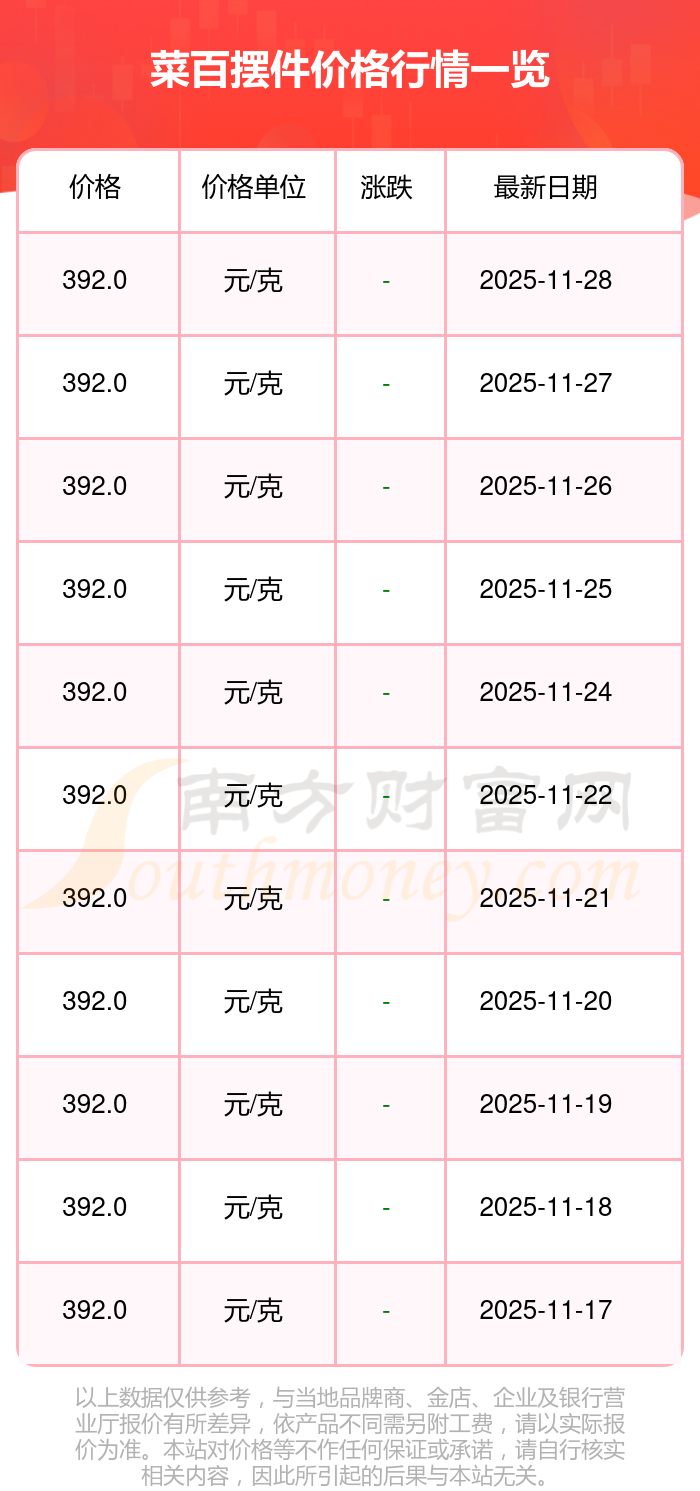 2025年11月29日菜百擺件價格查詢:392.0元/克。