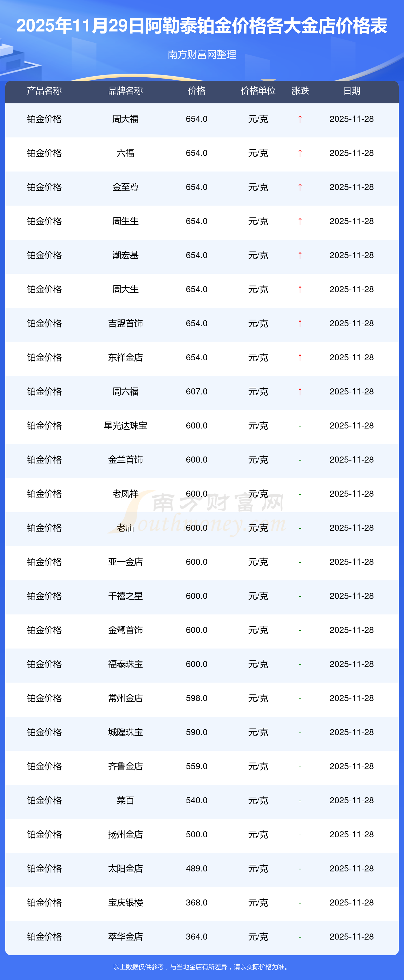 2025年11月29日,阿勒泰星光達(dá)珠寶、星光達(dá)珠寶、寶泉錢幣、金蘭首飾、金蘭首飾、謝瑞麟、謝瑞麟、謝瑞麟、謝瑞麟、謝瑞麟、金銀街等各大金店品牌鉑金價格今日價格行情最新來了:星光達(dá)珠寶1321.0元/克、星光達(dá)珠寶600.0元/克、寶泉錢幣12.6元/克、金蘭首飾1321.0元/克、金蘭首飾600.0元/克、謝瑞麟1207.0元/克、謝瑞麟1321.0元/克、謝瑞麟46370.0、謝瑞麟13970.0、謝瑞麟41860.0、金銀街1296.0元/克。