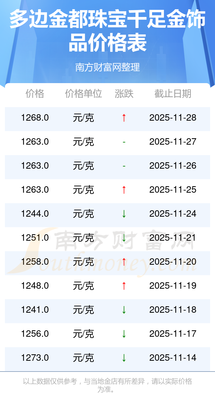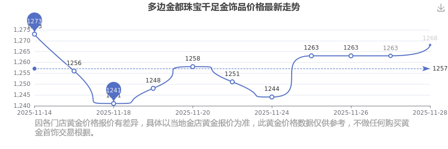 今日多邊金都珠寶所公布的 千足金飾品最新價(jià)格為1268.0元/克。