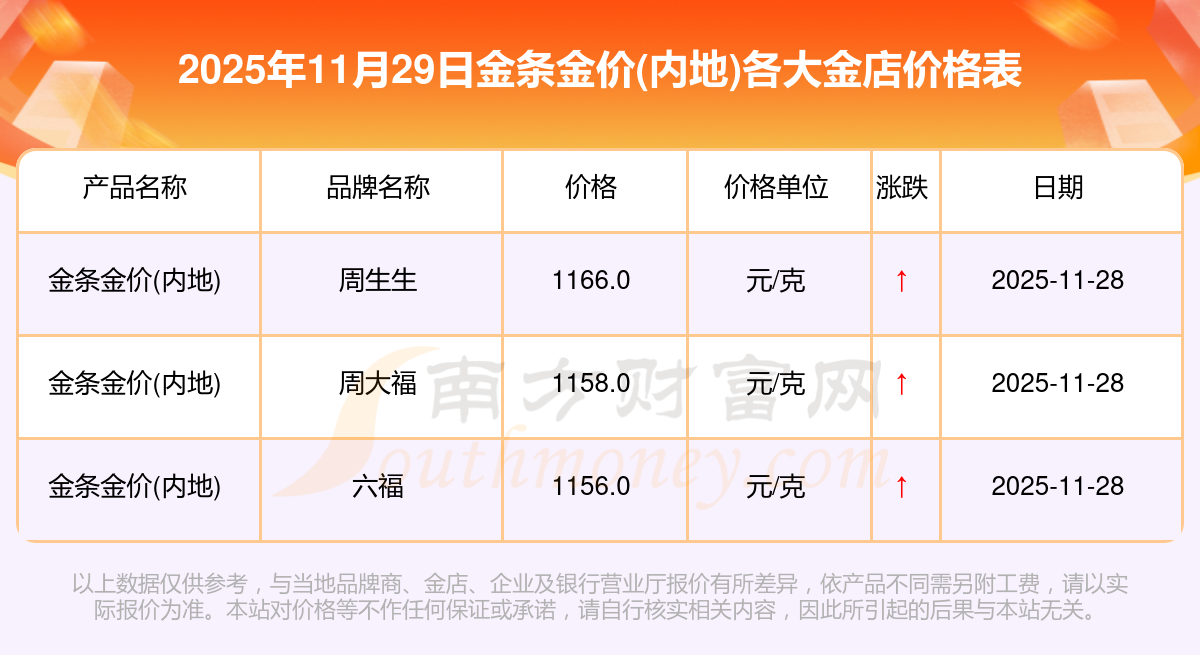 2025年11月29日各大金店金條金價(內(nèi)地)最新價格:星光達珠寶1321.0元/克,星光達珠寶600.0元/克,寶泉錢幣12.6元/克,金蘭首飾1321.0元/克,金蘭首飾600.0元/克,謝瑞麟1207.0元/克,謝瑞麟1321.0元/克,謝瑞麟46370.0,謝瑞麟13970.0,謝瑞麟41860.0,金銀街1296.0元/克。