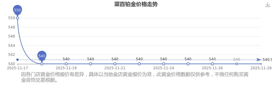 菜百 鉑金價(jià)格在今日更新至540.0元/克。