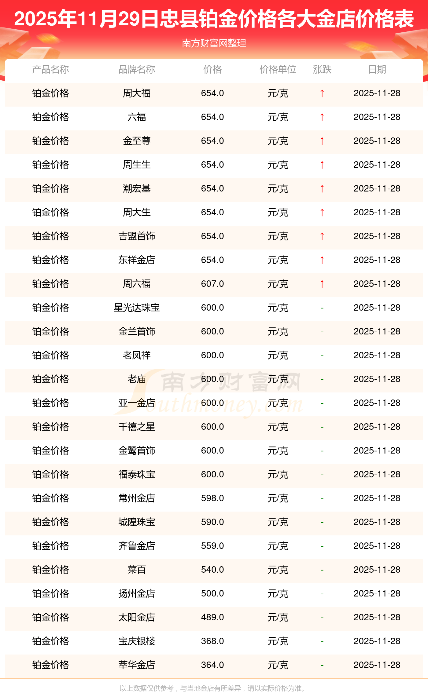 2025年11月29日忠縣各大金店鉑金價格最新價格:星光達珠寶1321.0元/克,星光達珠寶600.0元/克,寶泉錢幣12.6元/克,金蘭首飾1321.0元/克,金蘭首飾600.0元/克,謝瑞麟1207.0元/克,謝瑞麟1321.0元/克,謝瑞麟46370.0,謝瑞麟13970.0,謝瑞麟41860.0,金銀街1296.0元/克。