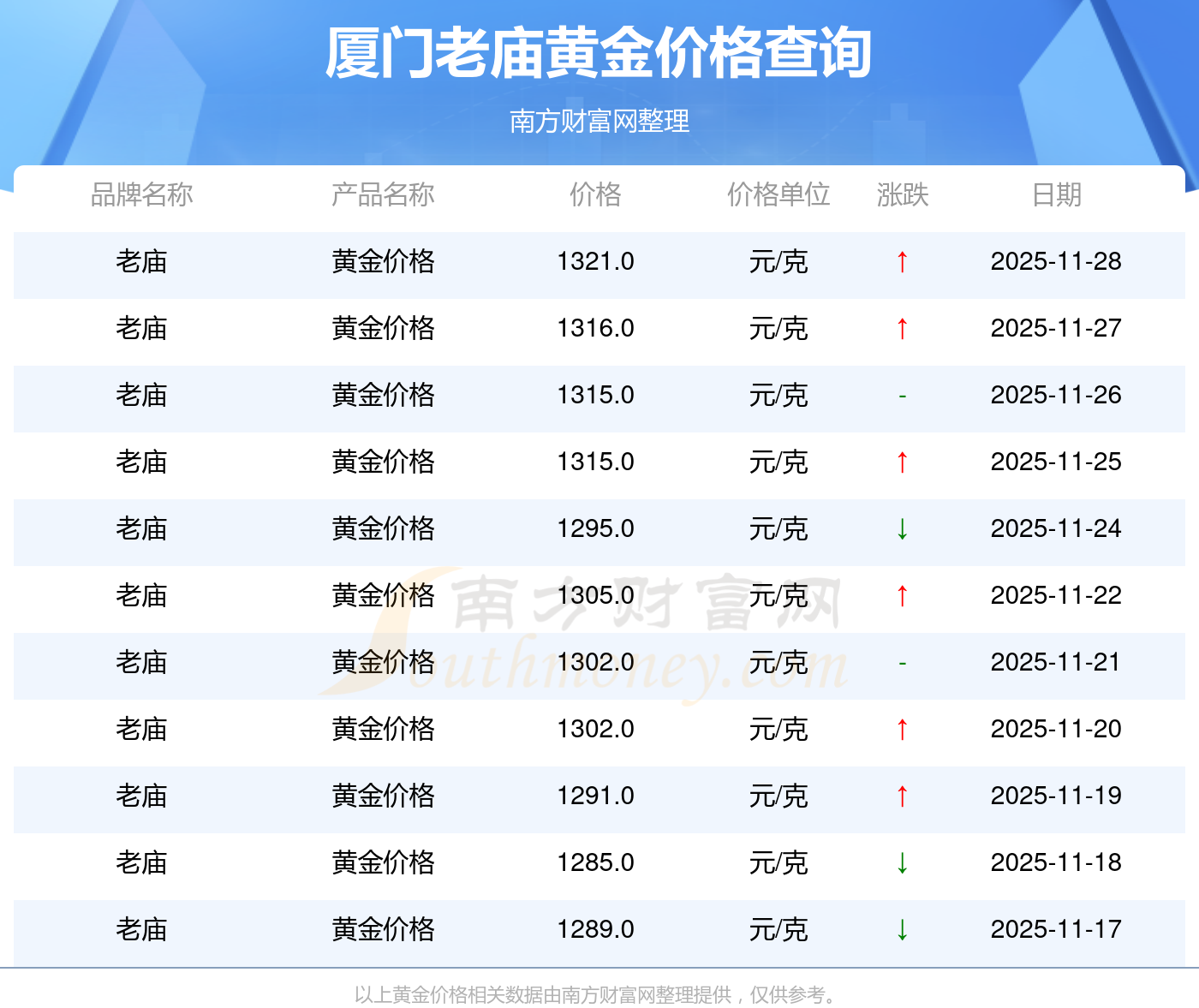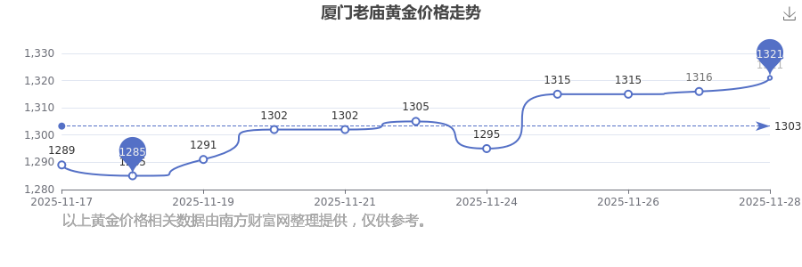今天黃金每克能賣多少錢?今日廈門老廟黃金價格查詢,2025年11月29日,廈門老廟黃金價格每克的價值量定格在1321.0元/克。