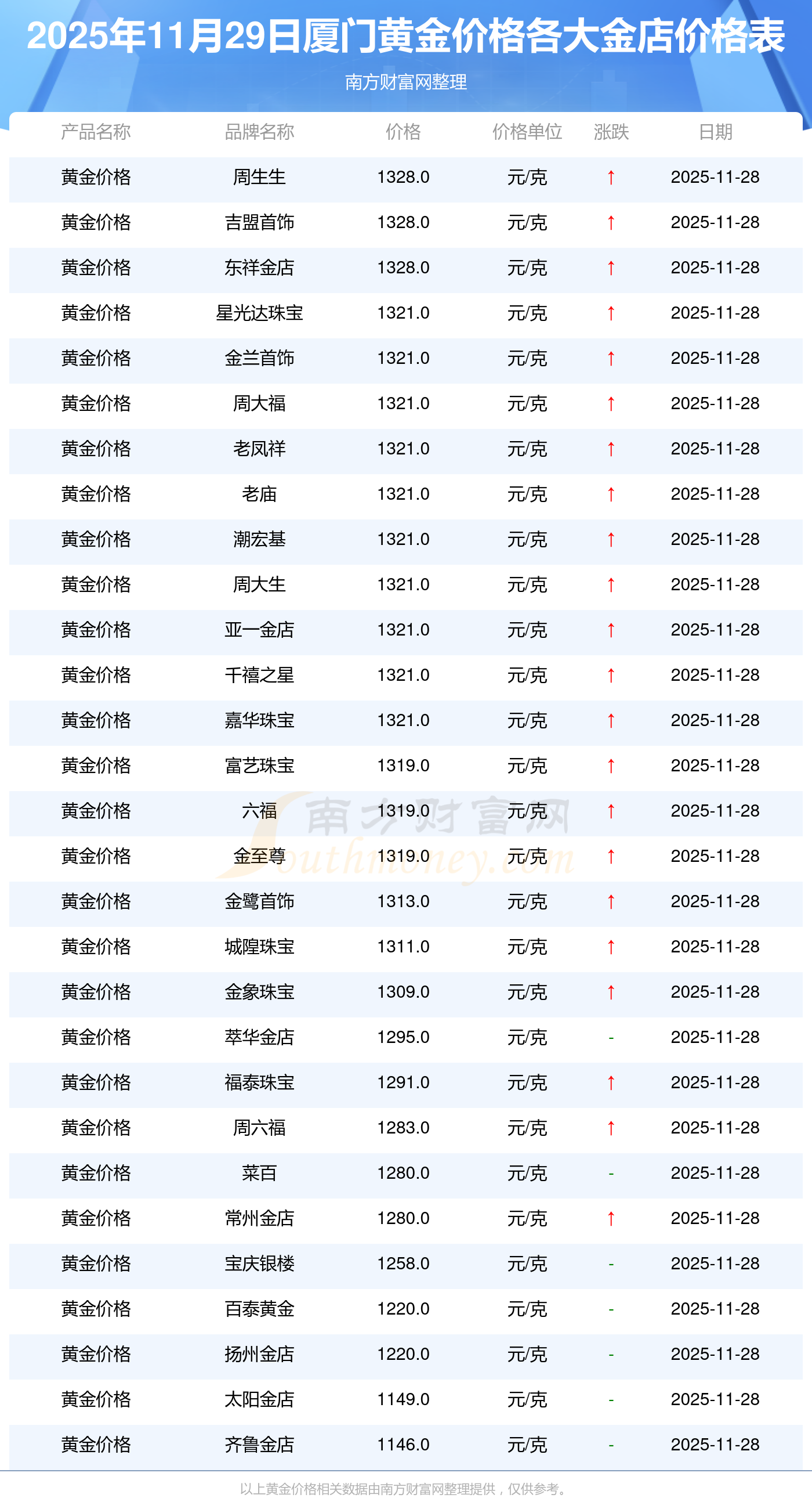 2025年11月29日,廈門星光達珠寶、星光達珠寶、寶泉錢幣、金蘭首飾、金蘭首飾、謝瑞麟、謝瑞麟、謝瑞麟、謝瑞麟、謝瑞麟、金銀街等各大金店品牌黃金價格今日價格如下:星光達珠寶1321.0元/克、星光達珠寶600.0元/克、寶泉錢幣12.6元/克、金蘭首飾1321.0元/克、金蘭首飾600.0元/克、謝瑞麟1207.0元/克、謝瑞麟1321.0元/克、謝瑞麟46370.0、謝瑞麟13970.0、謝瑞麟41860.0、金銀街1296.0元/克。