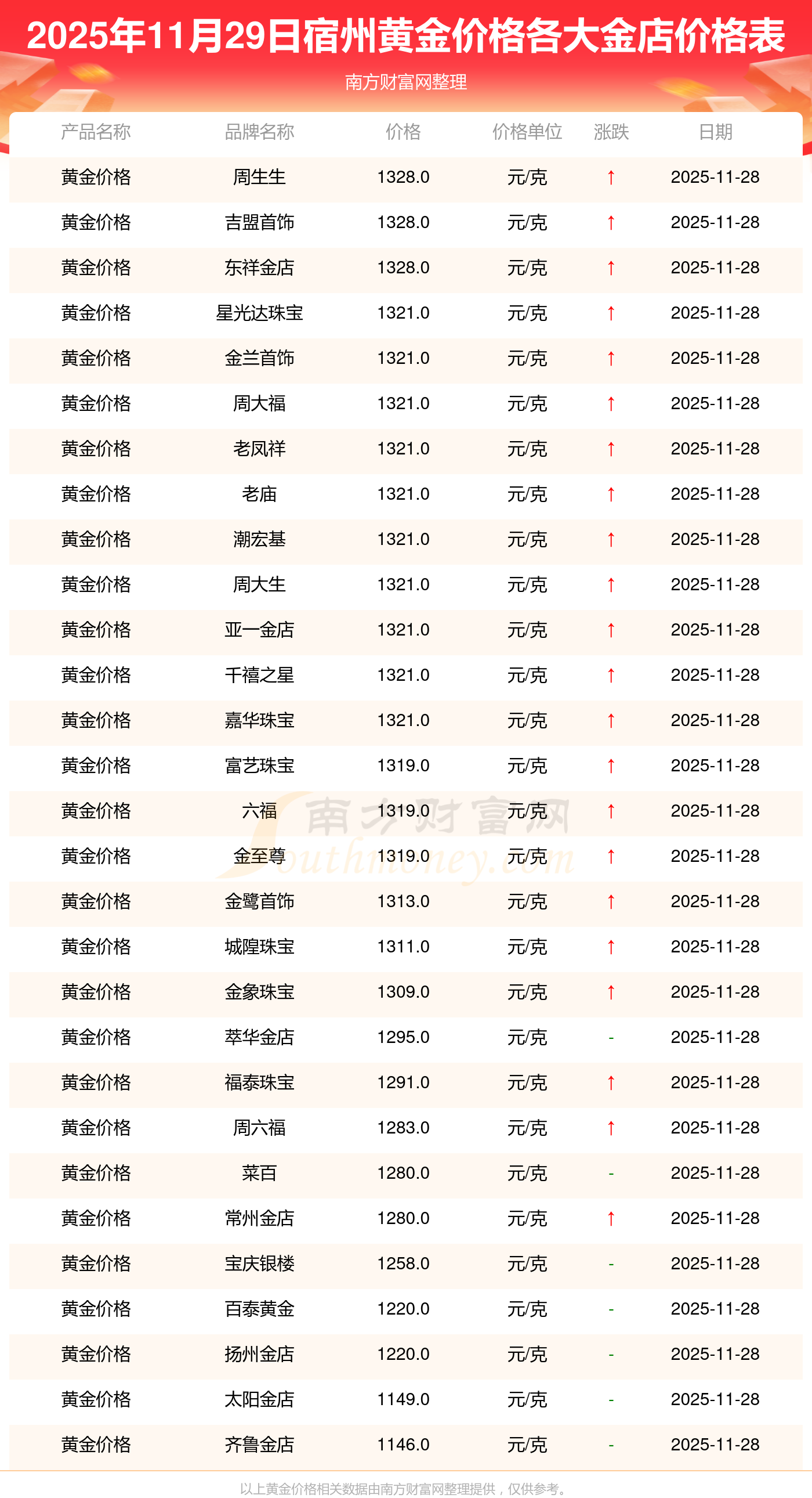 一、宿州各大金店黃金價格表,2025年11月29日宿州各大金店黃金價格多少錢一克?