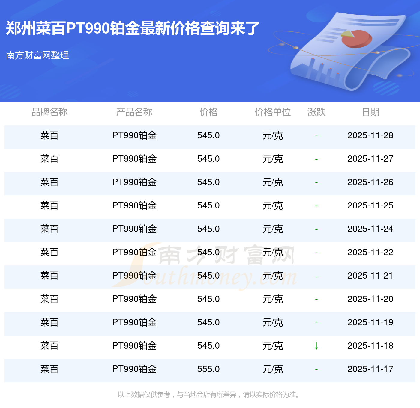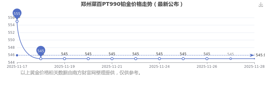 今日2025年11月29日,鄭州菜百PT990鉑金價格為545.0元/克。
