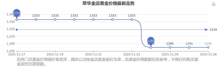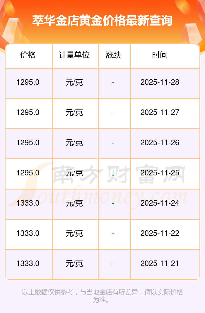 今天黃金價(jià)格行情如何?現(xiàn)在一克黃金的售價(jià)是多少?通常情況下1克黃金的價(jià)錢是多少左右?今日(2025年11月29日)萃華金店黃金價(jià)格:1295.0元/克。