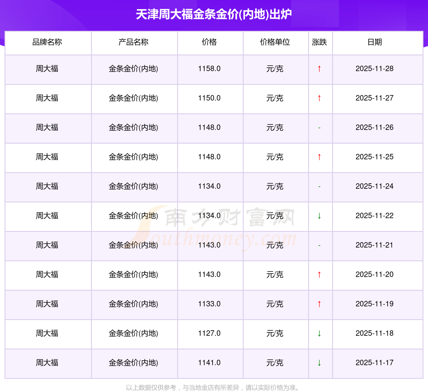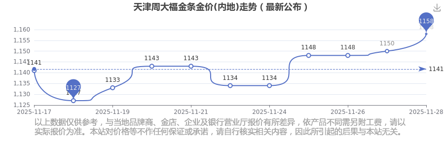 2025年11月29日天津周大福金條金價(jià)(內(nèi)地)是1158.0元/克。