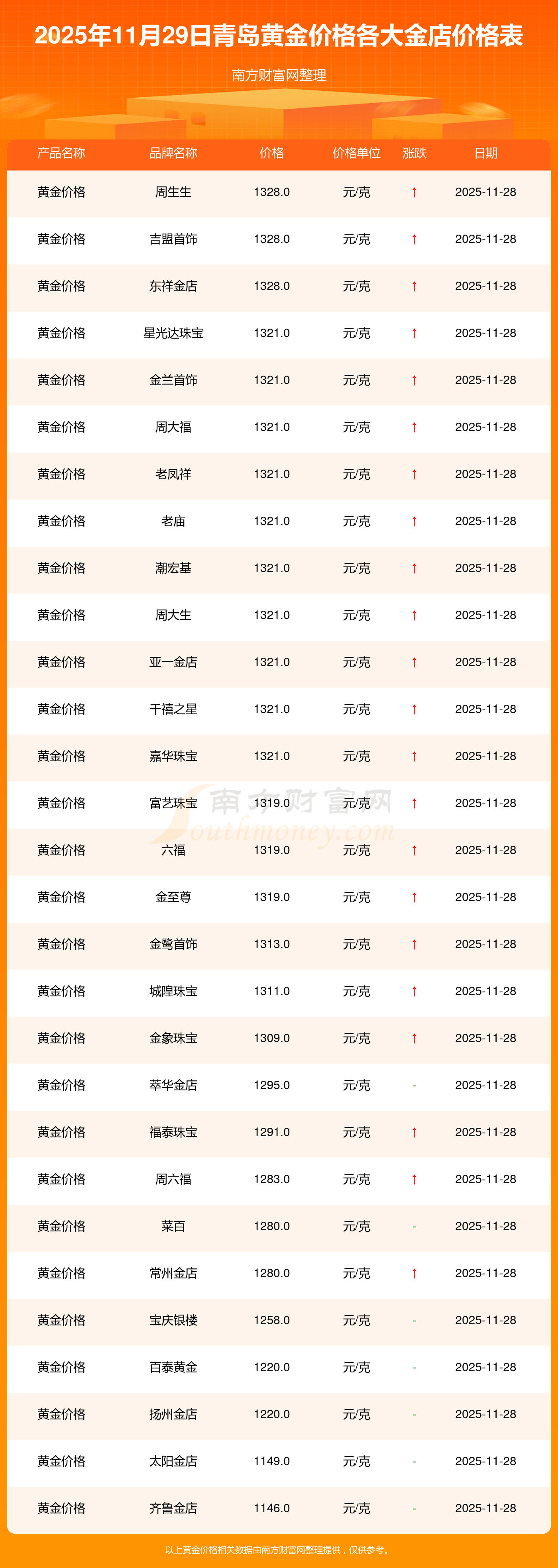 2025年11月29日,青島星光達(dá)珠寶、星光達(dá)珠寶、寶泉錢幣、金蘭首飾、金蘭首飾、謝瑞麟、謝瑞麟、謝瑞麟、謝瑞麟、謝瑞麟、金銀街等各大金店品牌黃金價(jià)格今日價(jià)格行情最新來(lái)了:星光達(dá)珠寶1321.0元/克、星光達(dá)珠寶600.0元/克、寶泉錢幣12.6元/克、金蘭首飾1321.0元/克、金蘭首飾600.0元/克、謝瑞麟1207.0元/克、謝瑞麟1321.0元/克、謝瑞麟46370.0、謝瑞麟13970.0、謝瑞麟41860.0、金銀街1296.0元/克。