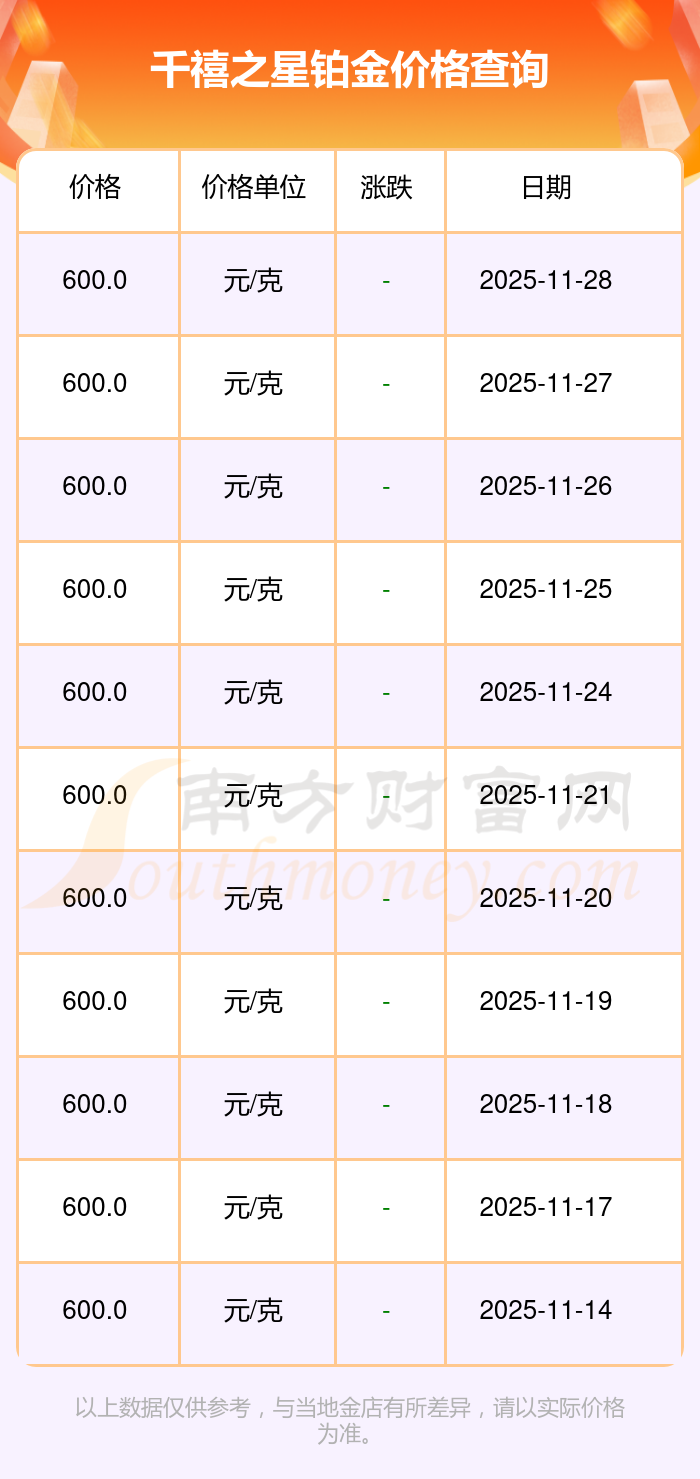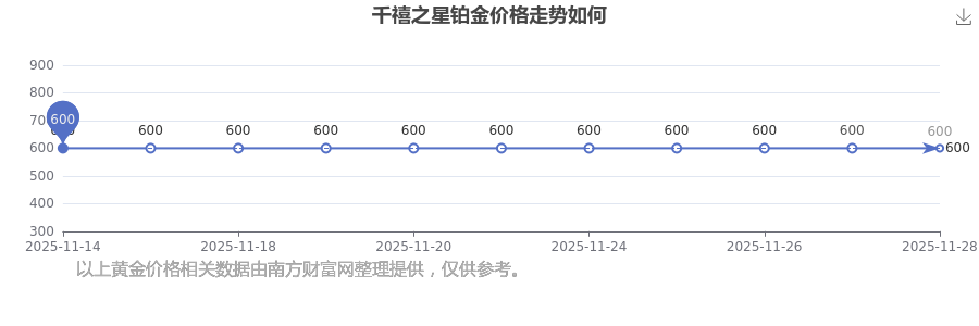 2025年11月29日千禧之星鉑金價格查詢:600.0元/克。