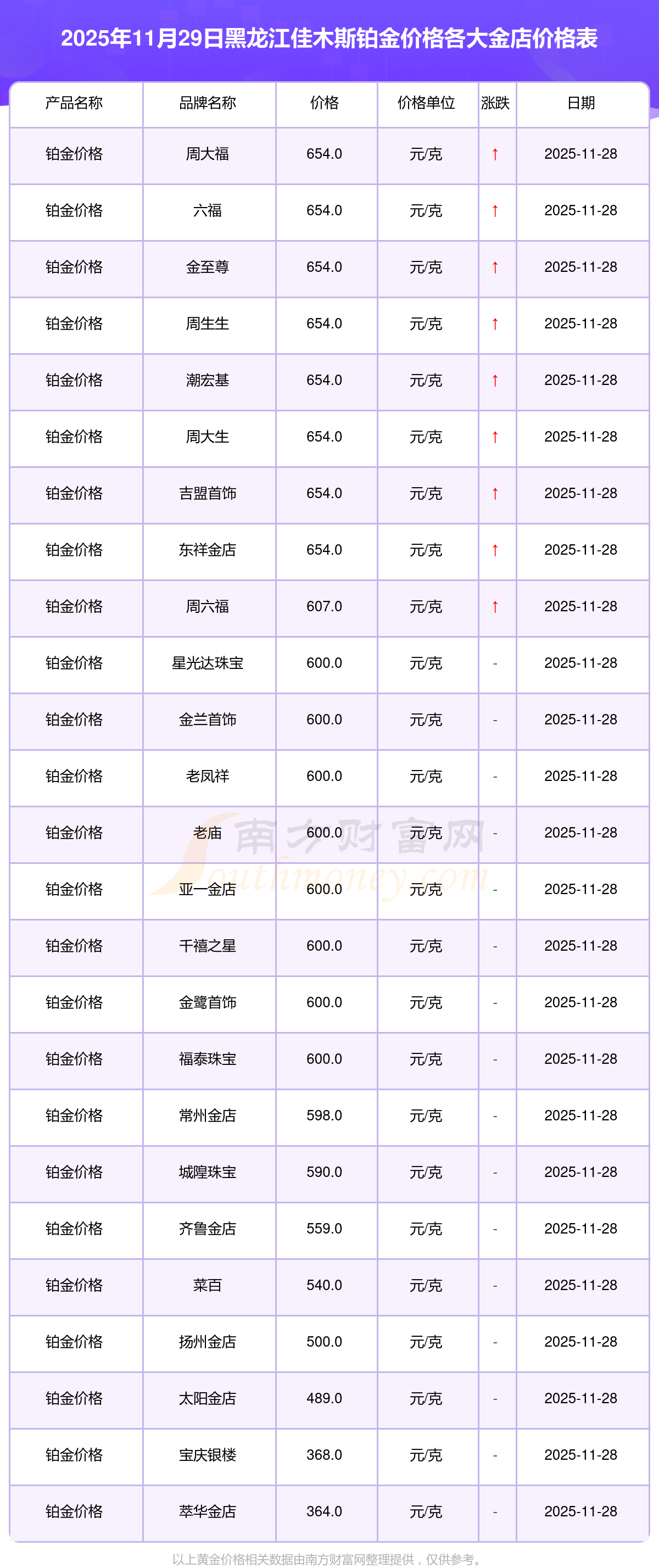 2025年11月29日,黑龍江佳木斯星光達珠寶、星光達珠寶、寶泉錢幣、金蘭首飾、金蘭首飾、謝瑞麟、謝瑞麟、謝瑞麟、謝瑞麟、謝瑞麟、金銀街等各大金店品牌鉑金價格今日價格行情最新來了:星光達珠寶1321.0元/克、星光達珠寶600.0元/克、寶泉錢幣12.6元/克、金蘭首飾1321.0元/克、金蘭首飾600.0元/克、謝瑞麟1207.0元/克、謝瑞麟1321.0元/克、謝瑞麟46370.0、謝瑞麟13970.0、謝瑞麟41860.0、金銀街1296.0元/克。
