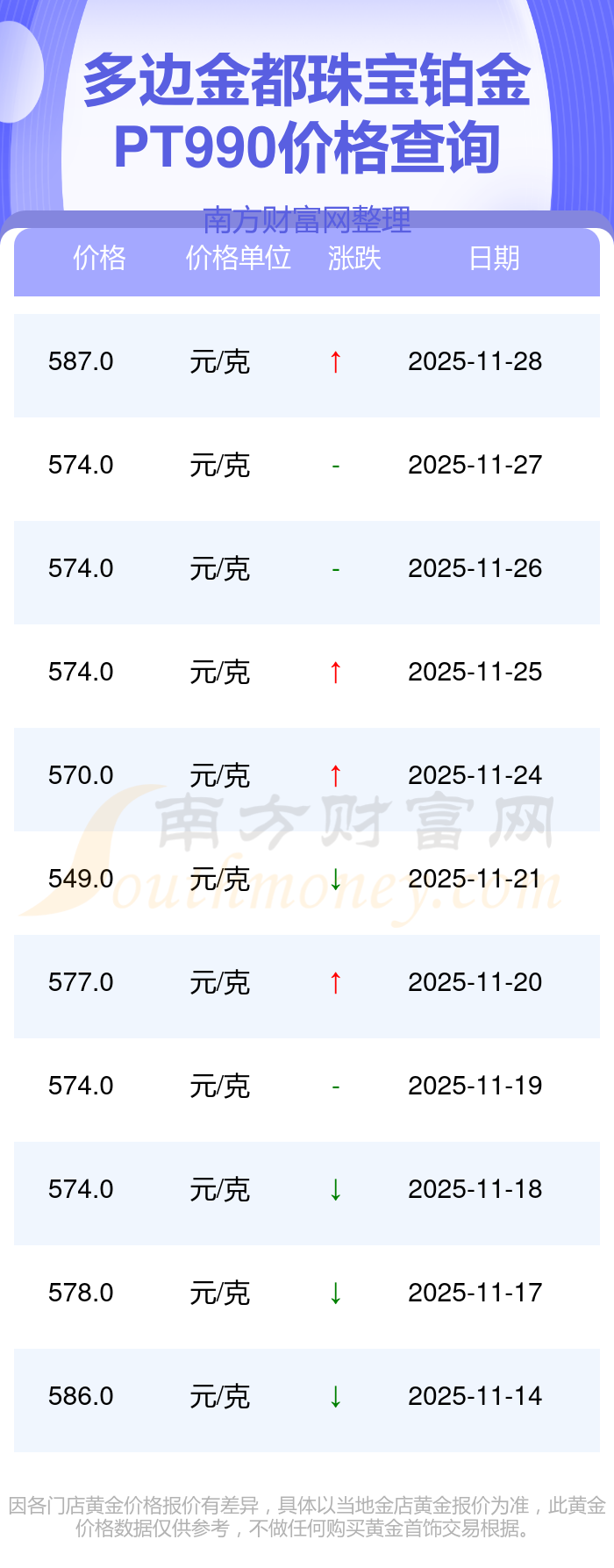 今日(2025年11月29日)多邊金都珠寶鉑金PT990的價(jià)格為587.0元/克。