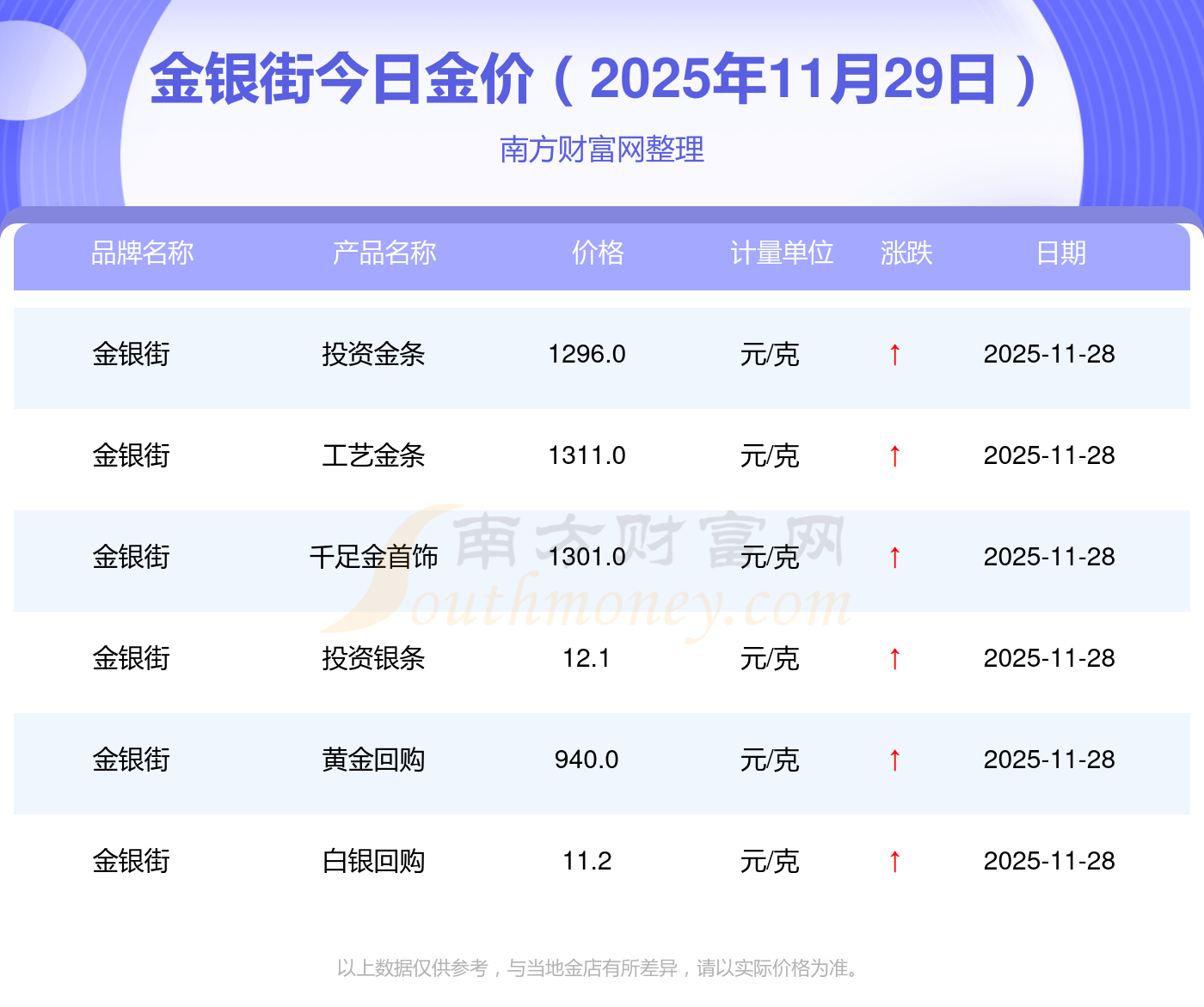 以上數(shù)據(jù)僅供參考,與當(dāng)?shù)仄放粕、金店、企業(yè)及銀行營業(yè)廳報價有所差異,依產(chǎn)品不同需另附工費,請以實際報價為準(zhǔn)。本站對價格等不作任何保證或承諾,請自行核實相關(guān)內(nèi)容,因此所引起的后果與本站無關(guān)。