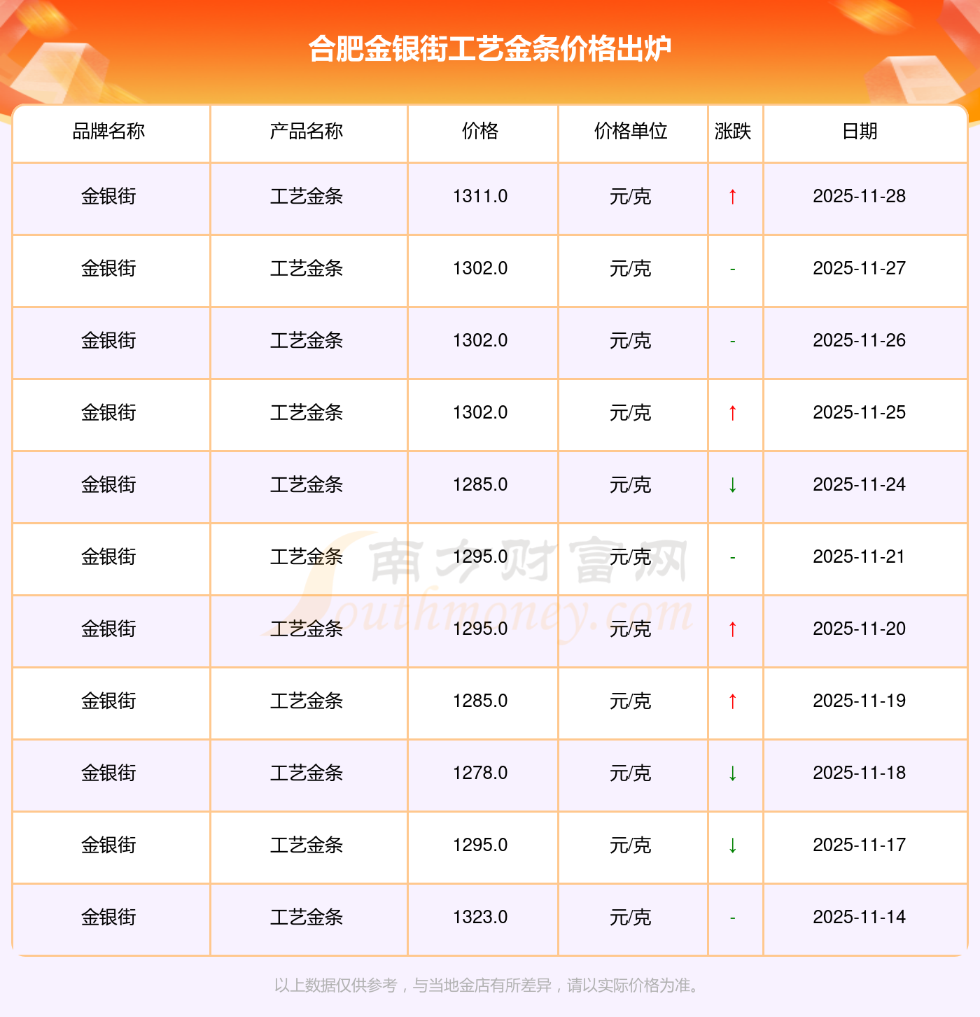 2025年11月29日這一天,合肥金銀街的工藝金條以 1311.0元/克的價格售賣。