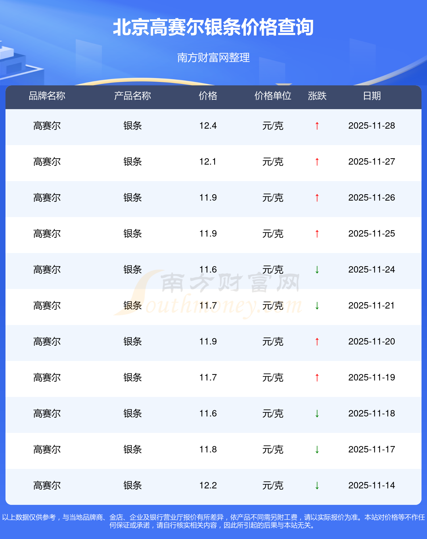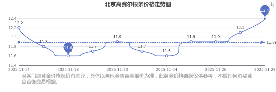 今日(2025年11月29日),北京高賽爾銀條的價(jià)格是12.4元/克。