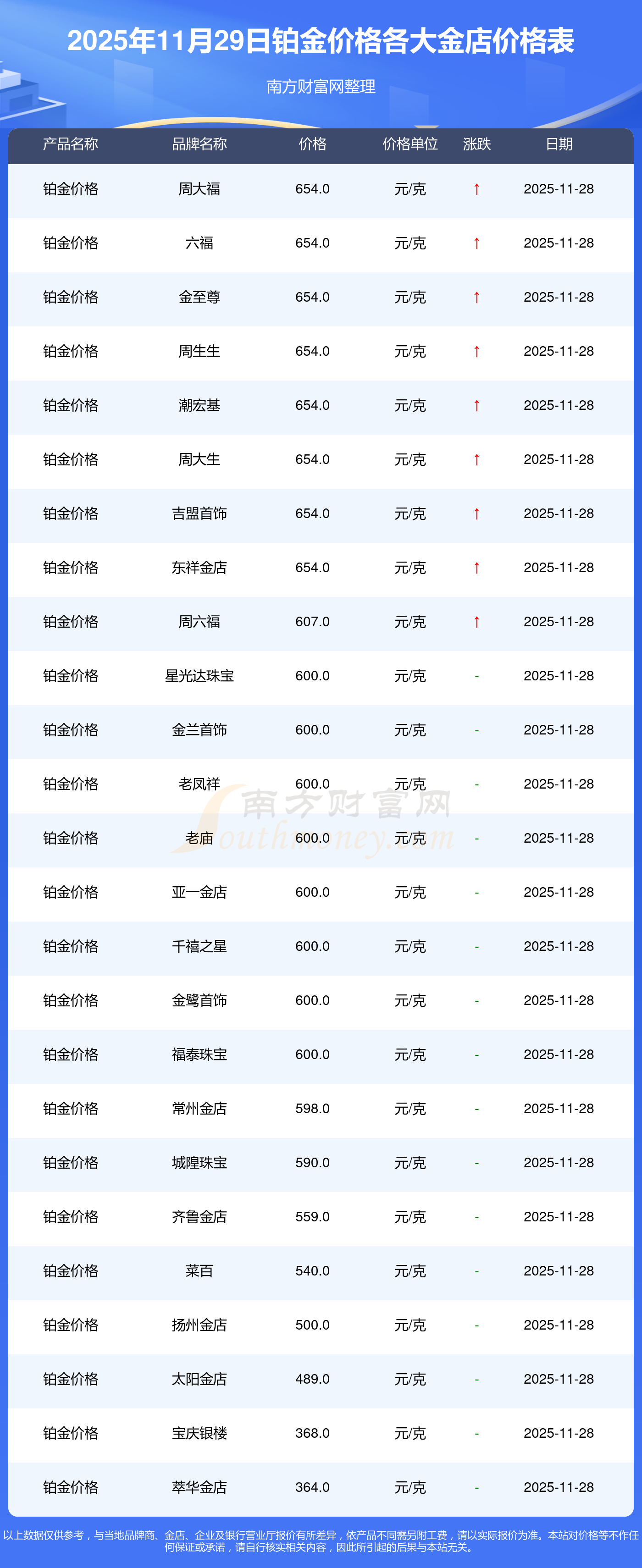 2025年11月29日各大金店鉑金價(jià)格最新價(jià)格:星光達(dá)珠寶1321.0元/克,星光達(dá)珠寶600.0元/克,寶泉錢幣12.6元/克,金蘭首飾1321.0元/克,金蘭首飾600.0元/克,謝瑞麟1207.0元/克,謝瑞麟1321.0元/克,謝瑞麟46370.0,謝瑞麟13970.0,謝瑞麟41860.0,金銀街1296.0元/克。