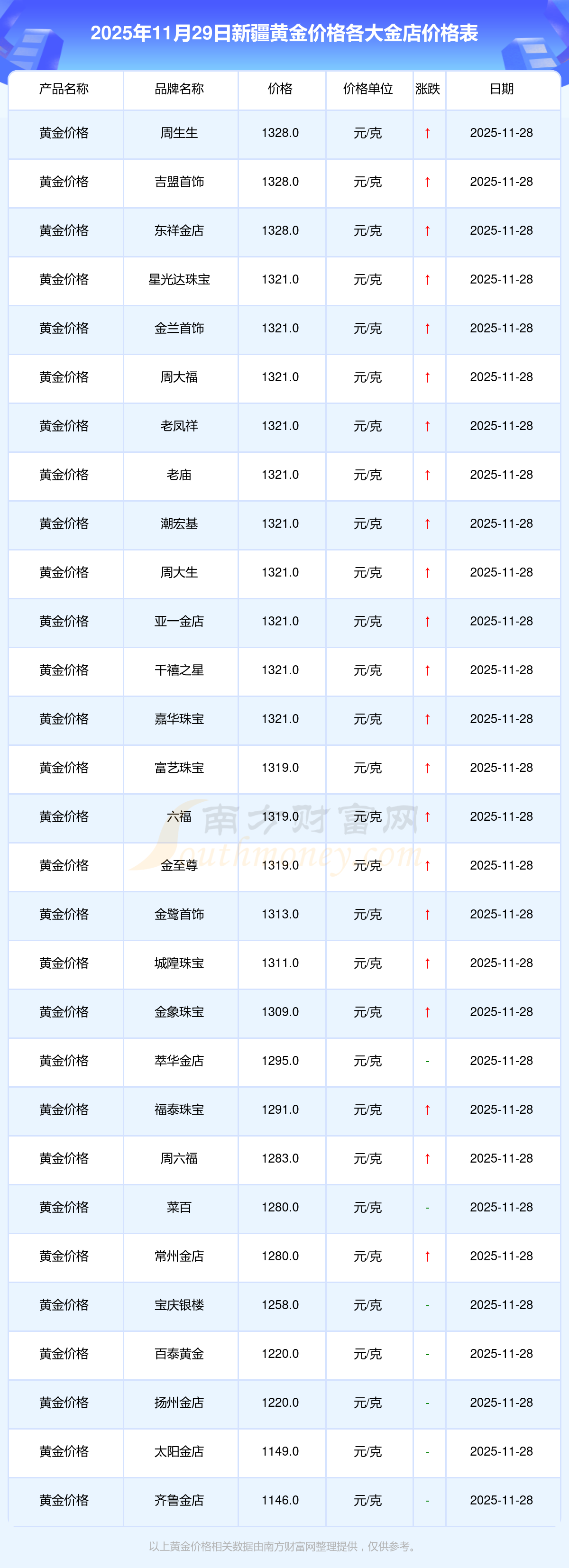 2025年11月29日新疆各金店黃金價(jià)格是多少錢(qián)一克?各金店黃金價(jià)格表