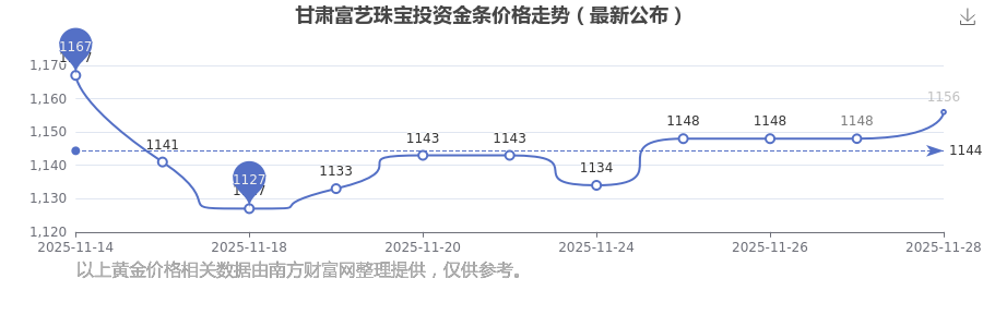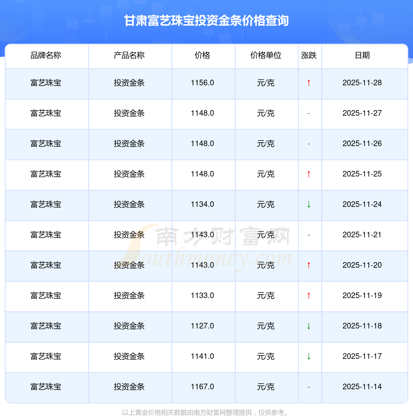 今日(2025年11月29日)甘肅富藝珠寶投資金條價格是1156.0元/克。
