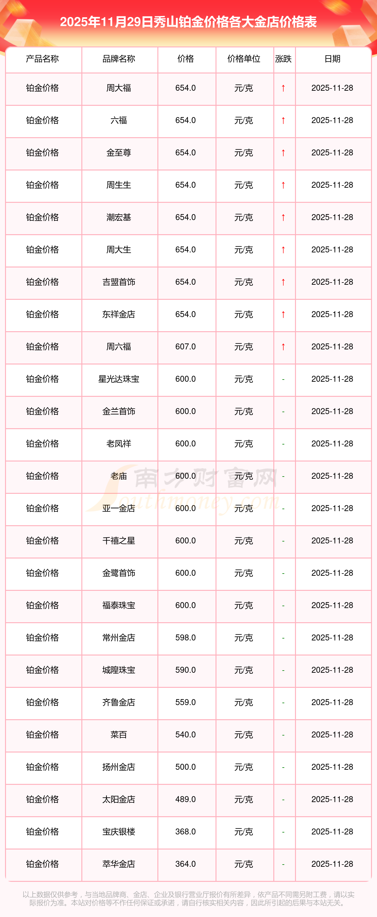 2025年11月29日秀山各大金店鉑金價格最新價格:星光達(dá)珠寶1321.0元/克,星光達(dá)珠寶600.0元/克,寶泉錢幣12.6元/克,金蘭首飾1321.0元/克,金蘭首飾600.0元/克,謝瑞麟1207.0元/克,謝瑞麟1321.0元/克,謝瑞麟46370.0,謝瑞麟13970.0,謝瑞麟41860.0,金銀街1296.0元/克。