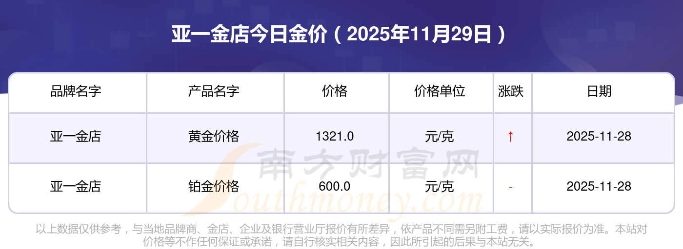 2025年11月29日,星光達(dá)珠寶、星光達(dá)珠寶、寶泉錢幣、金蘭首飾、金蘭首飾、謝瑞麟、謝瑞麟、謝瑞麟、謝瑞麟、謝瑞麟、金銀街等各大金店品牌黃金價(jià)格今日價(jià)格如下:星光達(dá)珠寶1321.0元/克、星光達(dá)珠寶600.0元/克、寶泉錢幣12.6元/克、金蘭首飾1321.0元/克、金蘭首飾600.0元/克、謝瑞麟1207.0元/克、謝瑞麟1321.0元/克、謝瑞麟46370.0、謝瑞麟13970.0、謝瑞麟41860.0、金銀街1296.0元/克。