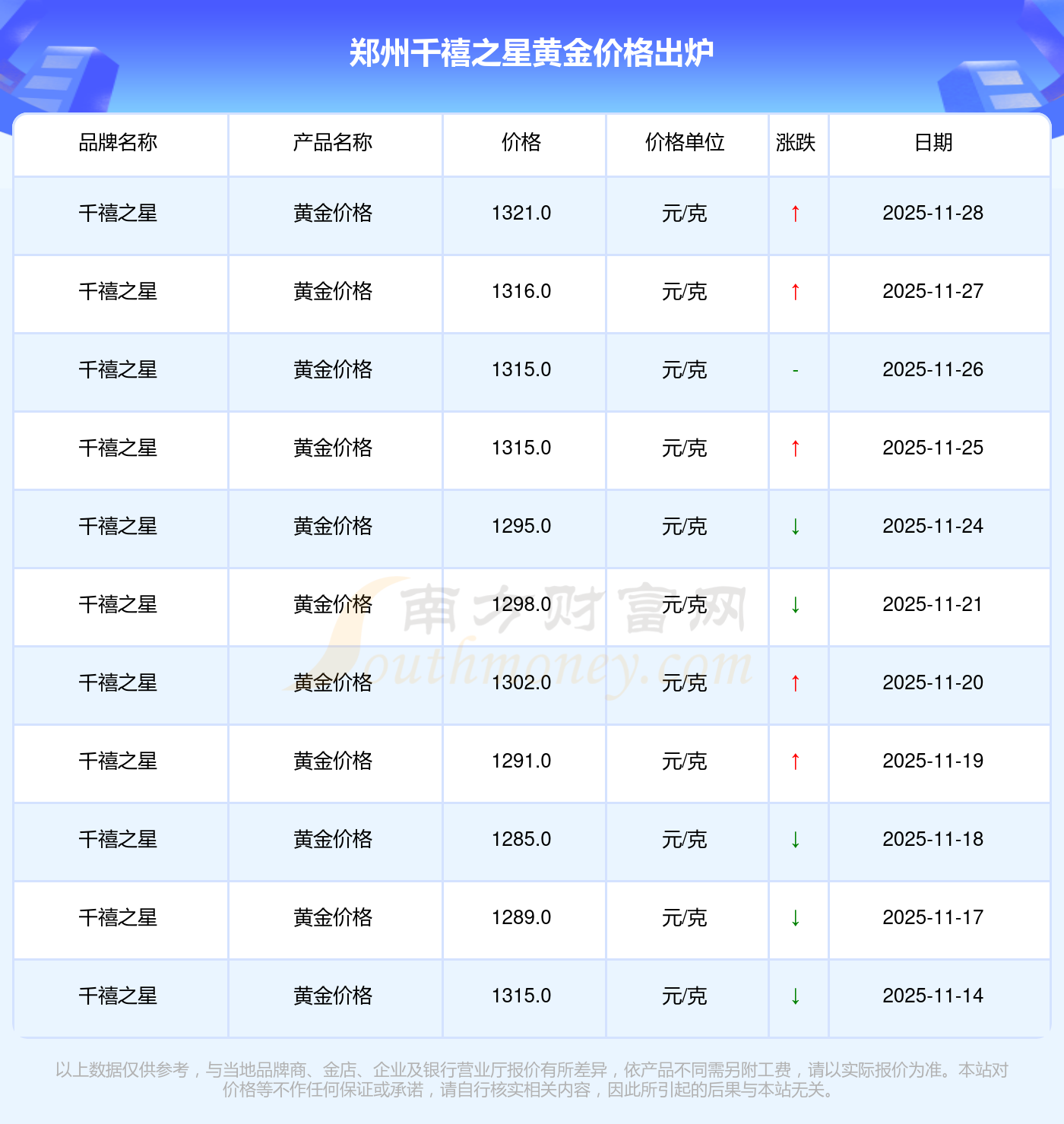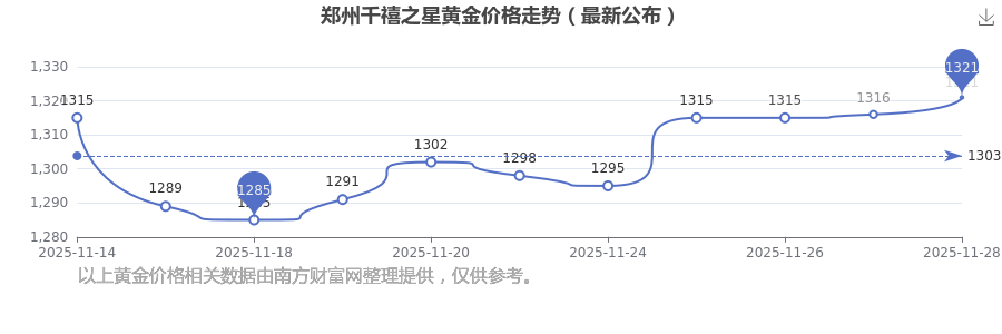 今日(2025年11月29日),鄭州千禧之星黃金價格:1321.0元/克。