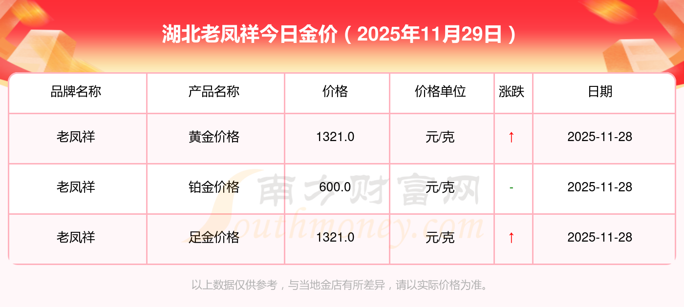 2025年11月29日湖北老鳳祥現(xiàn)在黃金一克要多少錢:黃金價(jià)格1321.0元/克,鉑金價(jià)格600.0元/克,銀條價(jià)格12.6元/克,黃金價(jià)格1321.0元/克,鉑金價(jià)格600.0元/克,金條價(jià)格(內(nèi)地)1207.0元/克,金飾價(jià)格(內(nèi)地)1321.0元/克,黃金飾品(香港)46370.0,鉑金飾品(香港)13970.0,金條金價(jià)(香港)41860.0,投資金條1296.0元/克。