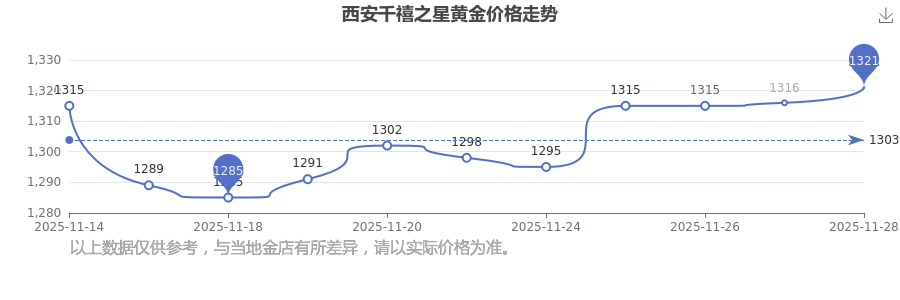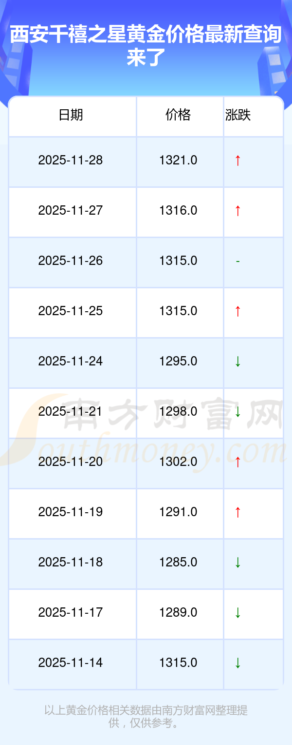 于 2025年11月29日,西安千禧之星黃金價(jià)格的克價(jià)為1321.0元/克。