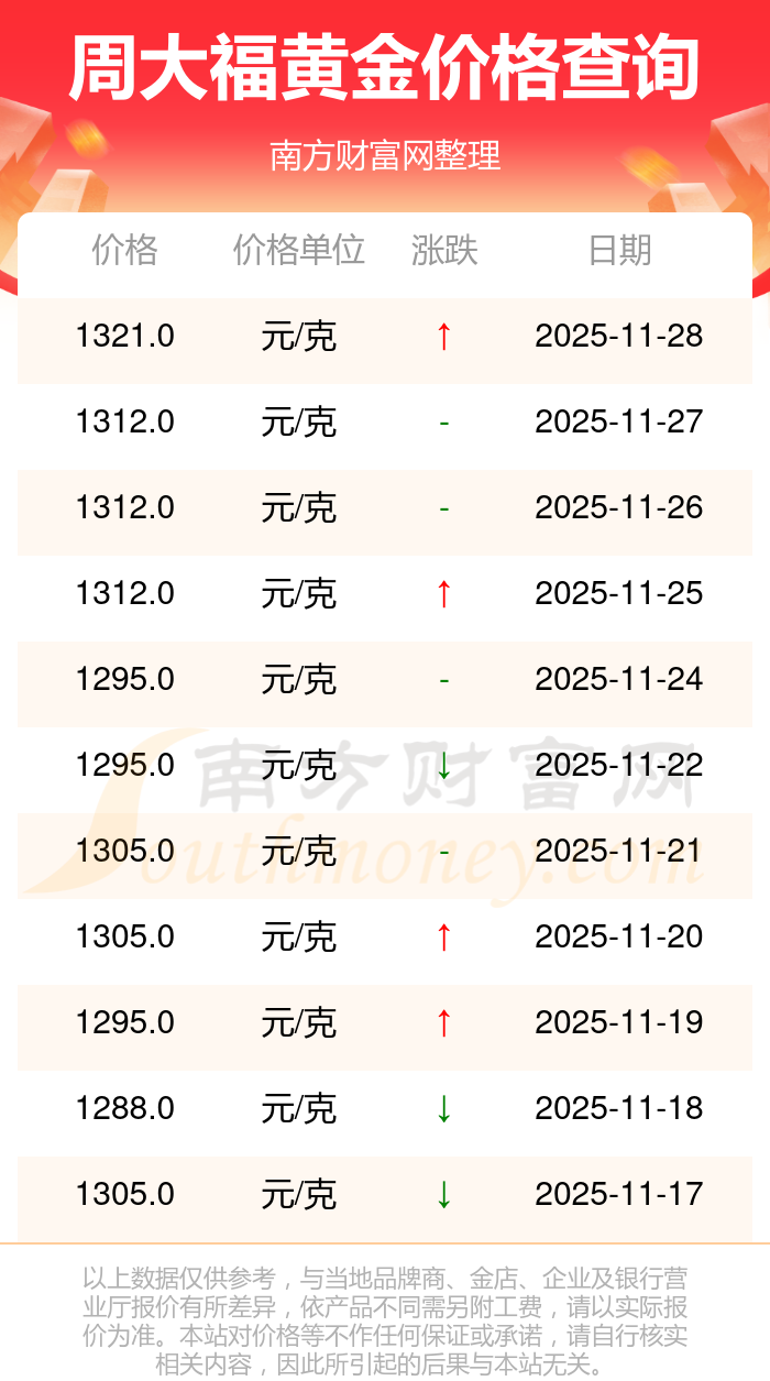 周大福 黃金價(jià)格于今日的最新掛牌價(jià)為1321.0元/克。