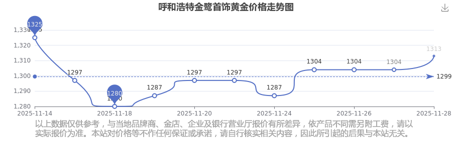 今日(2025年11月29日),呼和浩特金鷺首飾黃金價(jià)格:1313.0元/克。