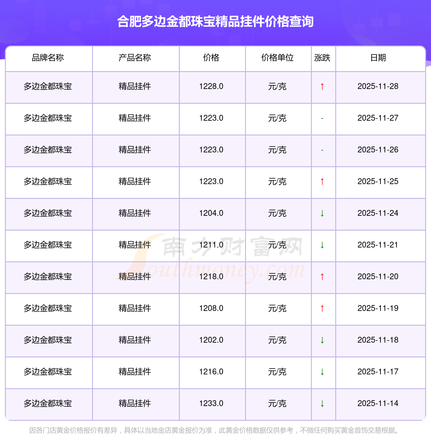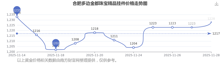 2025年11月29日,合肥多邊金都珠寶精品掛件每克的價(jià)值量定格在1228.0元/克。