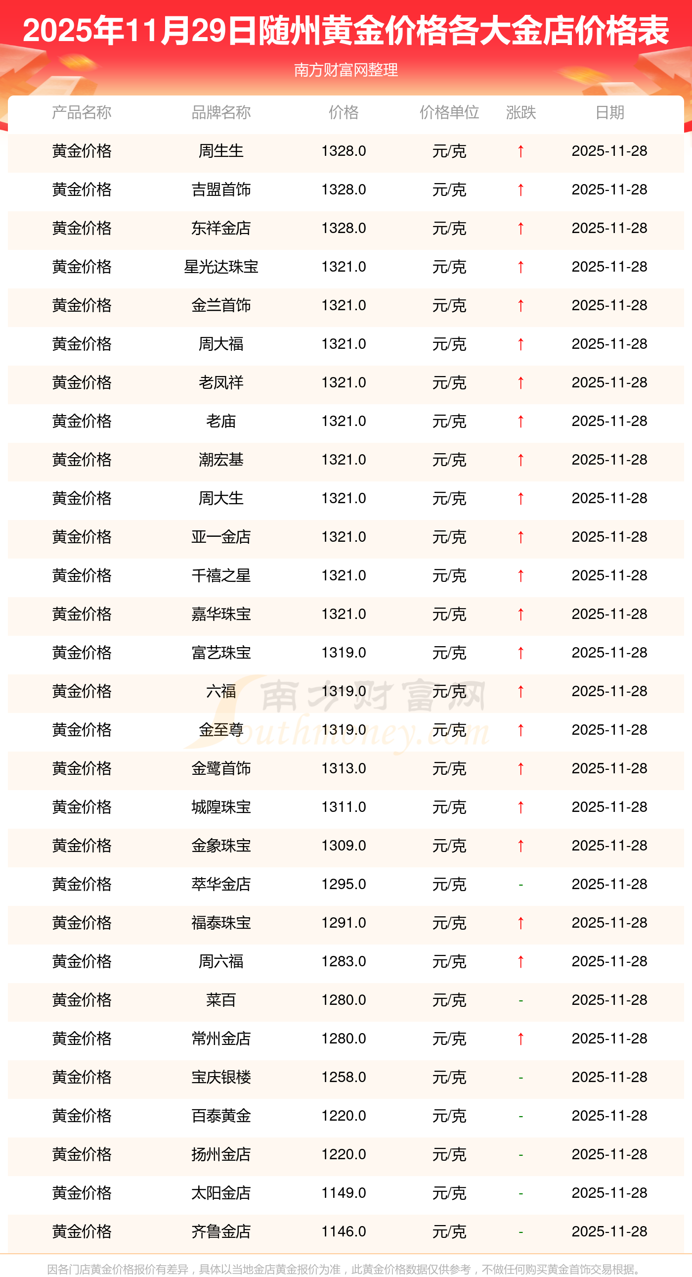 2025年11月29日,隨州星光達珠寶、星光達珠寶、寶泉錢幣、金蘭首飾、金蘭首飾、謝瑞麟、謝瑞麟、謝瑞麟、謝瑞麟、謝瑞麟、金銀街等各大金店品牌黃金價格今日價格行情最新來了:星光達珠寶1321.0元/克、星光達珠寶600.0元/克、寶泉錢幣12.6元/克、金蘭首飾1321.0元/克、金蘭首飾600.0元/克、謝瑞麟1207.0元/克、謝瑞麟1321.0元/克、謝瑞麟46370.0、謝瑞麟13970.0、謝瑞麟41860.0、金銀街1296.0元/克。