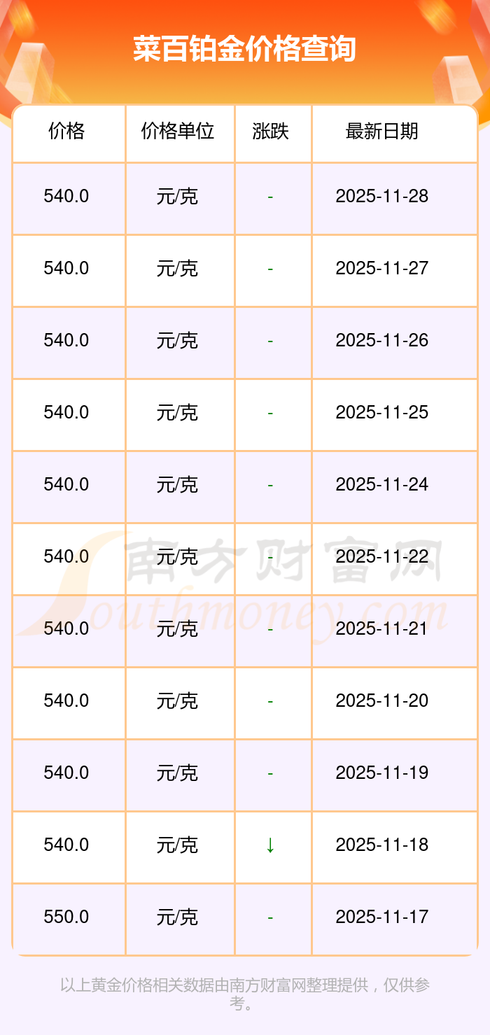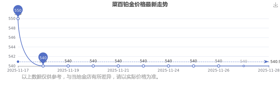 據(jù)了解,菜百今日鉑金價(jià)格為540.0元/克。