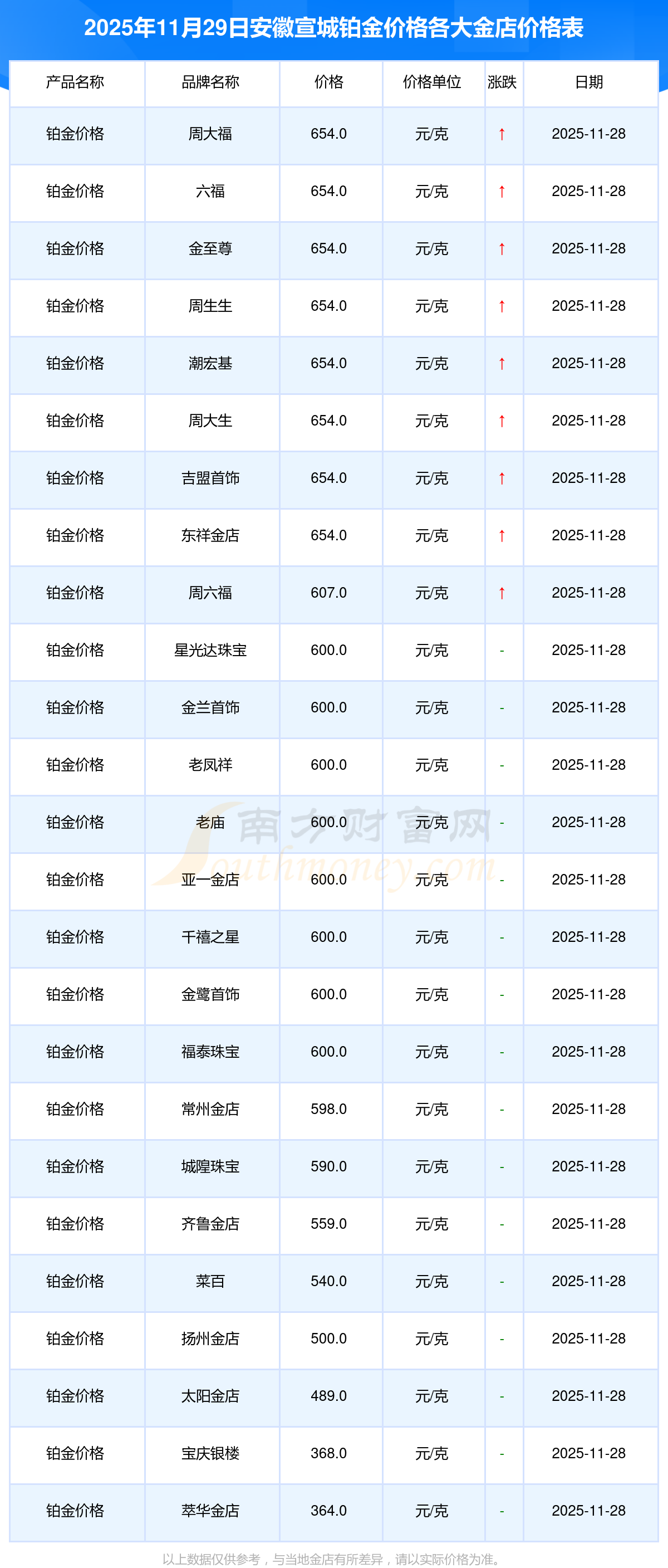 2025年11月29日安徽宣城星光達珠寶、星光達珠寶、寶泉錢幣、金蘭首飾、金蘭首飾、謝瑞麟、謝瑞麟、謝瑞麟、謝瑞麟、謝瑞麟、金銀街等各大金店品牌鉑金價格最新價格如下:星光達珠寶黃金價格1321.0元/克,星光達珠寶鉑金價格600.0元/克,寶泉錢幣銀條價格12.6元/克,金蘭首飾黃金價格1321.0元/克,金蘭首飾鉑金價格600.0元/克,謝瑞麟金條價格(內(nèi)地)1207.0元/克,謝瑞麟金飾價格(內(nèi)地)1321.0元/克,謝瑞麟黃金飾品(香港)46370.0,謝瑞麟鉑金飾品(香港)13970.0,謝瑞麟金條金價(香港)41860.0,金銀街投資金條1296.0元/克。